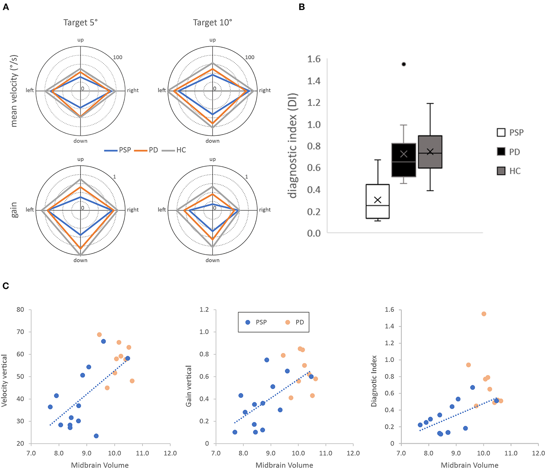 (A) Top row, saccadic mean velocity for the three subject groups for targets at 5â—¦ (left) and 10â—¦ (right) visual eccentricity. Bottom row, saccadic gain for the three subject groups for targets at 5â—¦ (left) and 10â—¦ (right) visual eccentricity. (B) Boxplots of the diagnostic index (DI), computed as the product of the ratios of vertical to horizontal gain and velocity, for the three subject groups. (C) Scatterplots show significant correlations between oculomotor parameters and midbrain volume in the progressive supranuclear palsy (blue dots) but not the Parkinson's disease (orange dots) group.