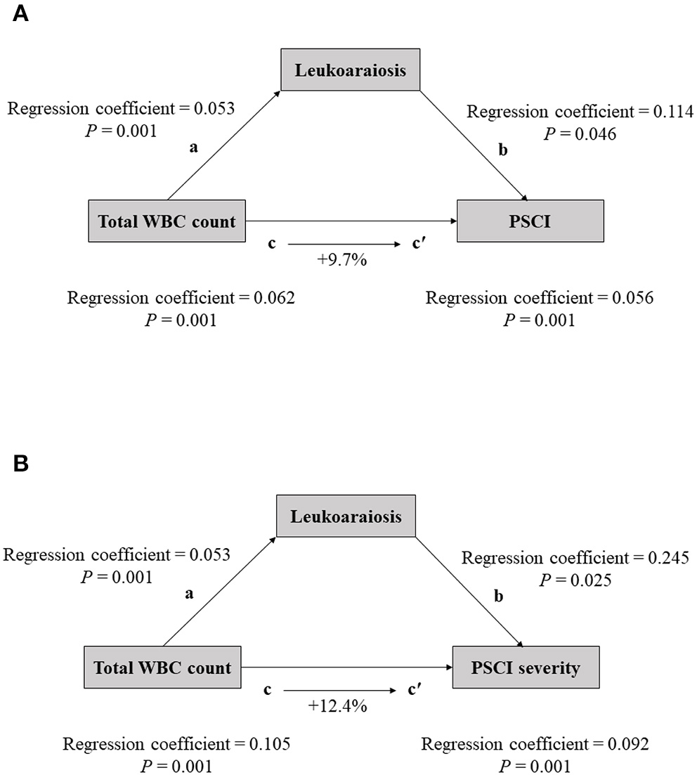 A total of 276 patients (mean age, 66.5 years; 54.7% male) were included in this analysis. Among them, 137 (49.6%) patients experienced PSCI. After adjustment for potential confounders, higher total WBC count was significantly correlated with an increased risk of LA [per 1-SD increase, odds ratio (OR), 1.39; 95% CI 1.06–1.82; p = 0.017] and PSCI (per 1-SD increase, OR, 1.51; 95% CI 1.12–2.04; p = 0.006). Furthermore, mediation analysis demonstrated that the association between total WBC count and PSCI was partly mediated by LA (the regression coefficient was changed by 9.7% for PSCI, and 12.4% for PSCI severity, respectively).