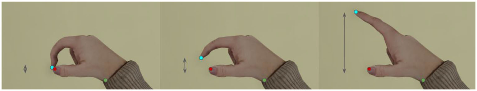 Finger tapping task. Participants were indicated to perform finger taping by extending the index finger from the thumb. The arrows indicate the distance between the index and thumb, and was used as a time series from which features were derived. The colored circles indicate the tip of the thumb (red) and index (blue) and the wrist (green).