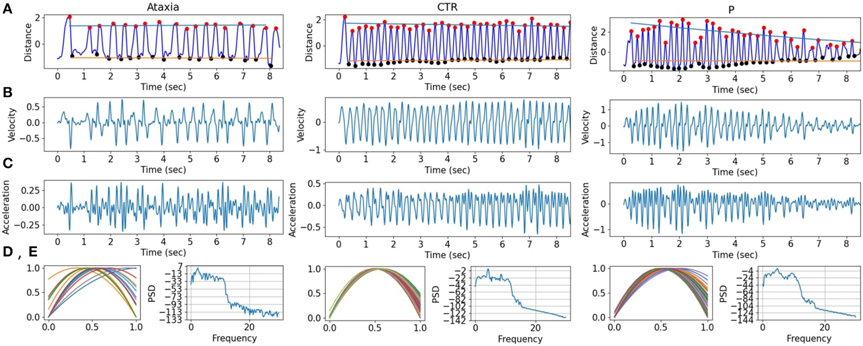 Finger tapping signals in ataxia, control (CTR), and parkinsonism (P) example subjects. (A) The finger tapping, measured as the normalized distance between the tip of the index and the thumb. The peaks (red) and troughs (black) are marked with dots, and the slope for the peaks and troughs are drawn in blue and orange, respectively. (B,C) First and second derivatives of the FT signal are shown. (D) The normalized quadratic modeling of the finger tapping is plotted for each tap. (E) The power spectrum density of the FT.