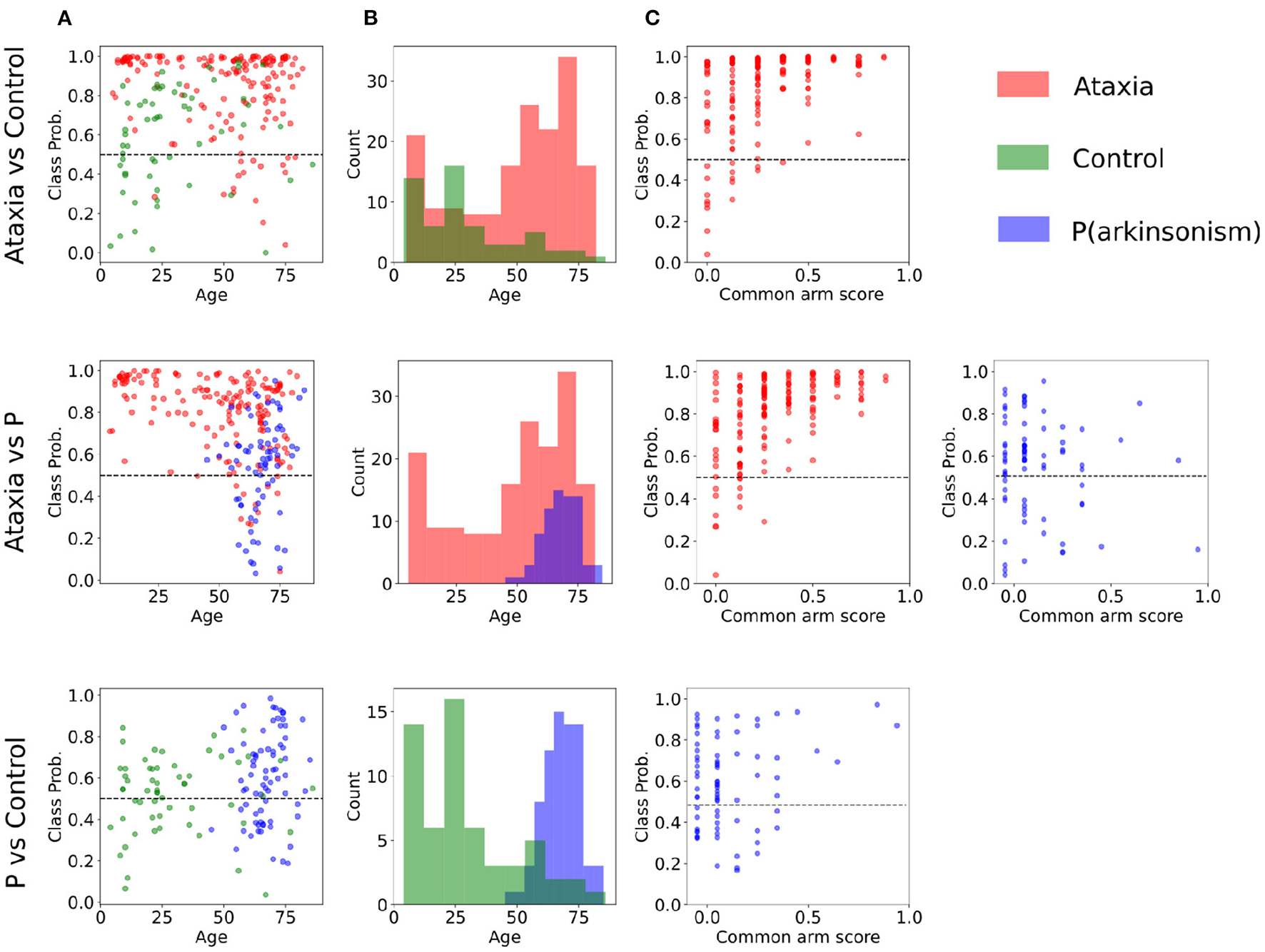 Classification probabilities and age distribution between pairs of groups. (A) Subjects' probability of the true class as plotted a function of age (incorrect predictions are below the dotted line). (B) Age distribution of each group. (C) Subjects' classification probability plotted as a function of symptom severity for the Ataxia and parkinsonism (P) groups.