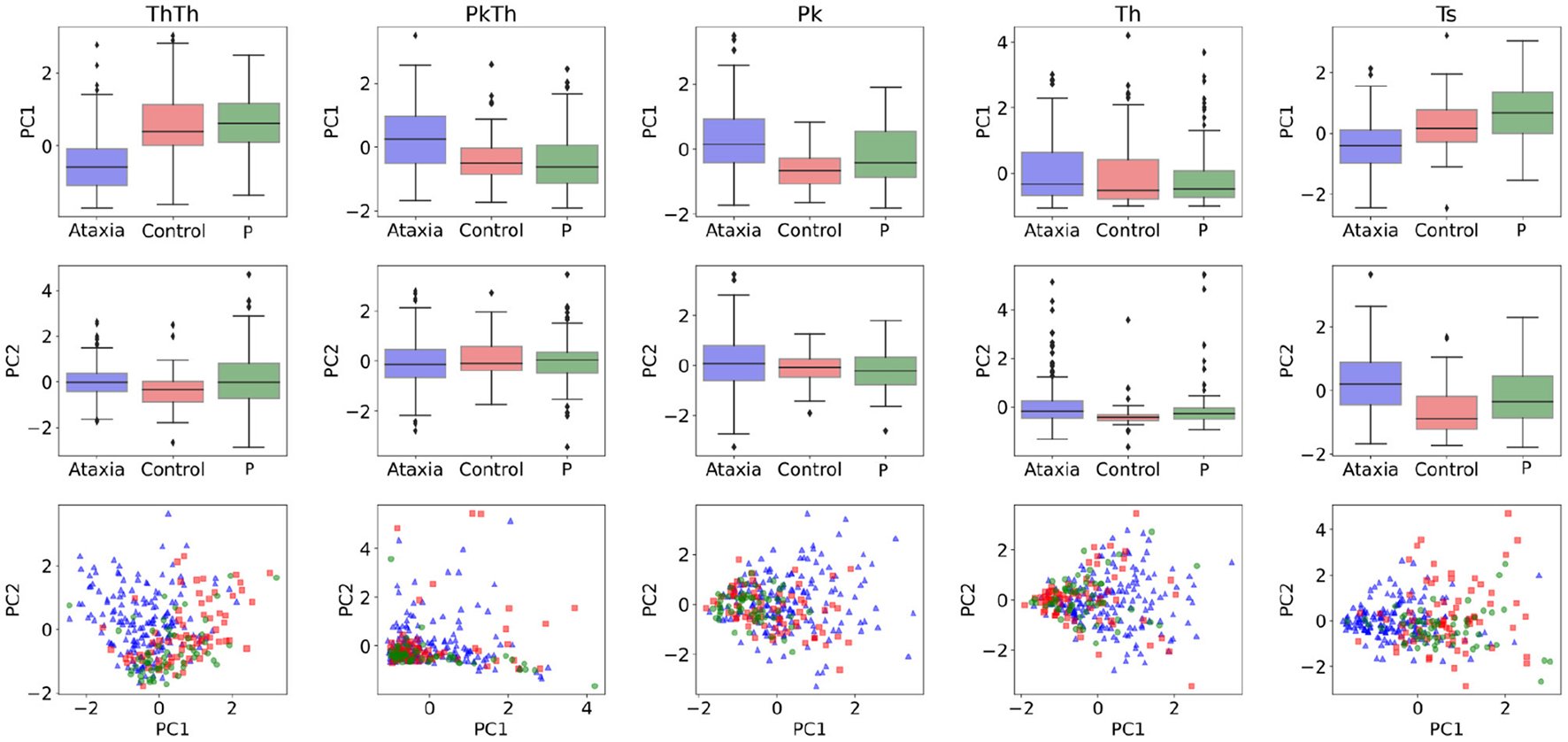 In order to understand the general feature categories that contributed to model performance, on Figure 4 first two rows feature group box plots for the first and second PC representing the mean and quartiles of their distributions. Although the models are multivariate, individual visual inspection of the groups provide a sense of their discriminative power. This can be noted with the first PC of the Th-Th where the mean of the ataxia group is lower compared to the other groups. On Figure 4 row 3, the first two principal components are represented in a scatter plot. The separation between groups becomes more evident, with the ataxia group being spatially more separated than parkinsonism and controls, and explains the higher performance of the models in detecting ataxia.