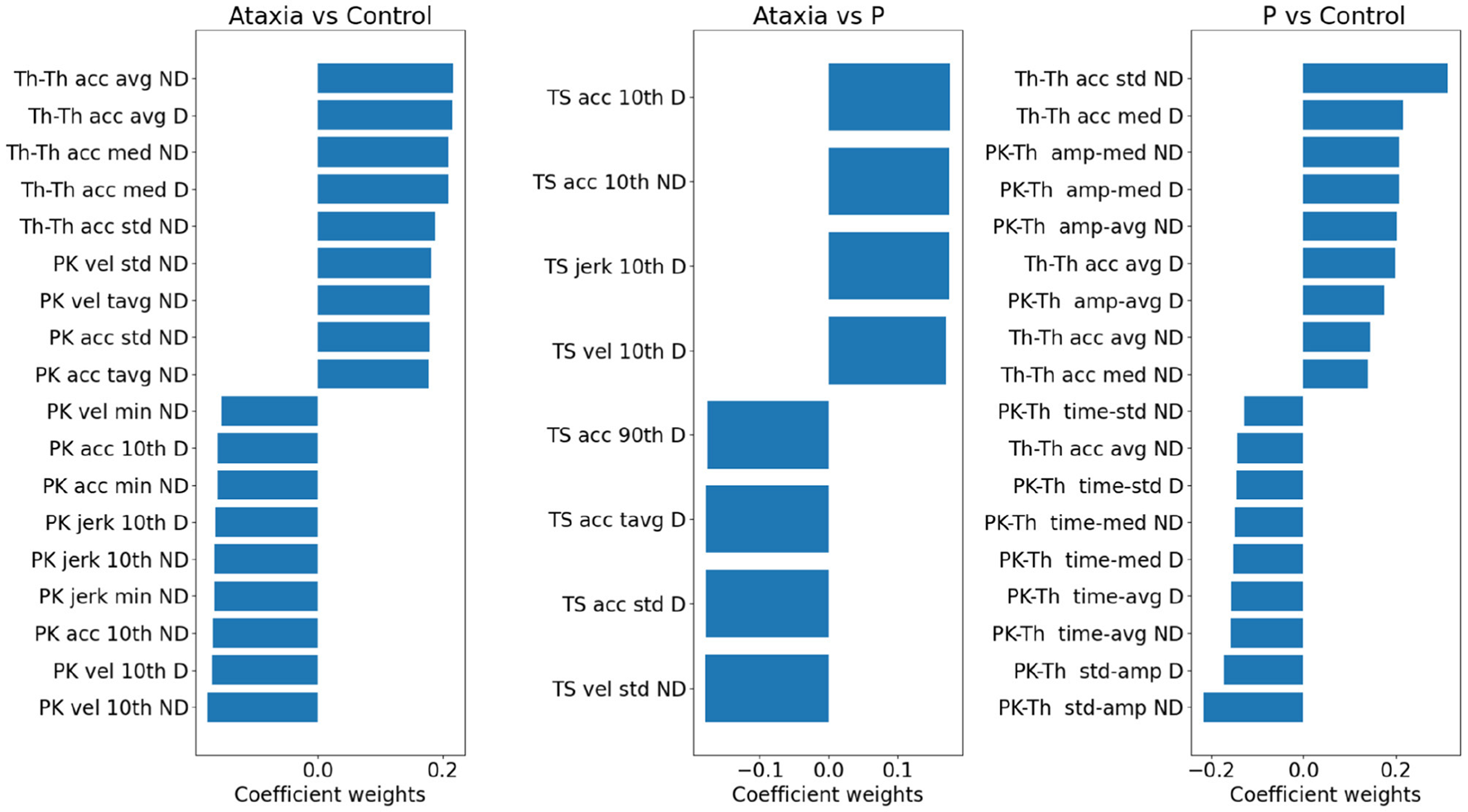 Model weights for group classification in ataxia, control and parkinsonism (P). For each pair of groups, a bar plot indicates the contribution of individual features in discriminating group classes. The bar plot values reflect the model weights of the PC features *individual weight of the PC. Positive weights denote higher feature values in the first group and vice versa. Only the largest 2% of the features are plotted. Due to the L1 penalty, some features were assigned zero weights and not plotted, hence for the Ataxia vs. parkinsonism the number of features are smaller than the other group pairs. vel, velocity; acc, acceleration; avg, average; tavg, total or absolute average; amp, amplitude; med, median; pth10, 10th percentile; pth90, 90th percentile.