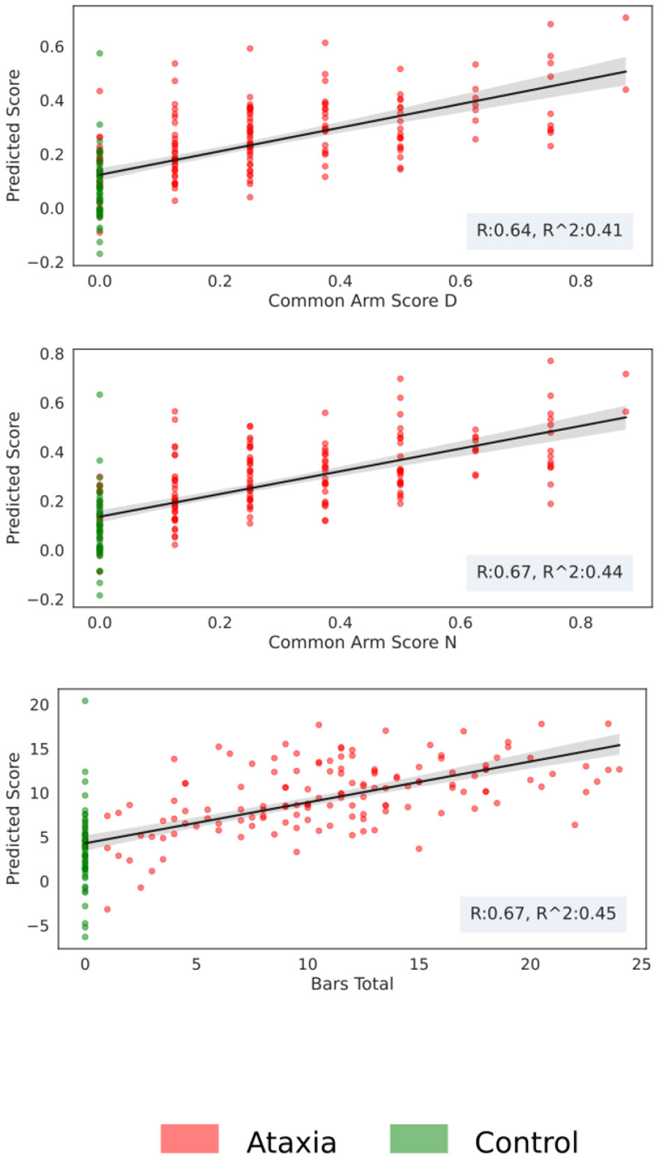 For regression analysis, to allow comparison between Ataxia and parkinsonism patients, arm scores and total scores were normalized. For Ataxia, the common arm score was the BARS arm score, which is based on the finger to nose task, scaled in the unit range. A common arm severity score was calculated for the parkinsonism group by combining UPDRS tests involving the arms. The tasks used for this purpose included bradykinesia on three tasks. These subscores were summated to form a composite severity score (range 0–12) and scaled to unit range. CTR participants were assigned zero values for the common arm scores.