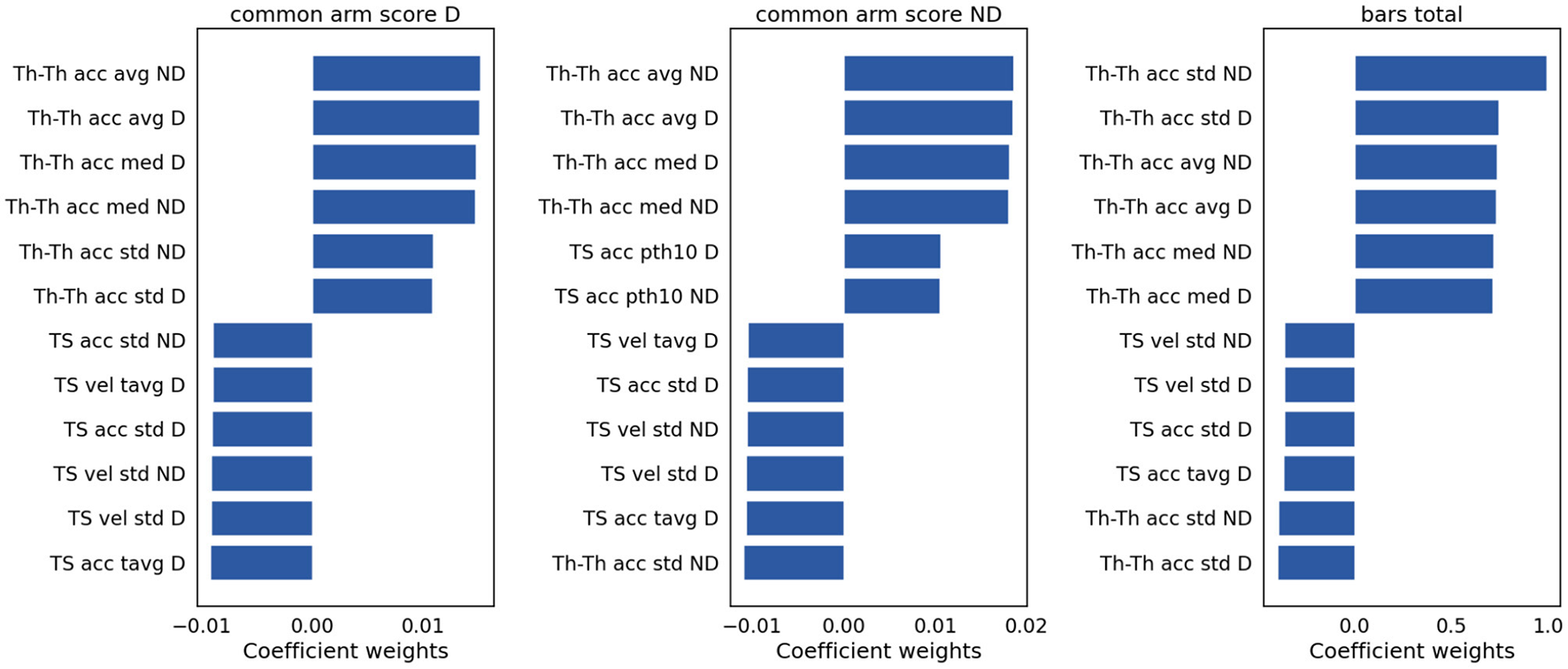 Model weights for clinical scores prediction. The bar plots indicate the magnitude and the sign of each feature contribution to predict the clinical scores. vel, velocity; acc, acceleration; avg, average; tavg, total or absolute average; med, median; pth10, 10th percentile.