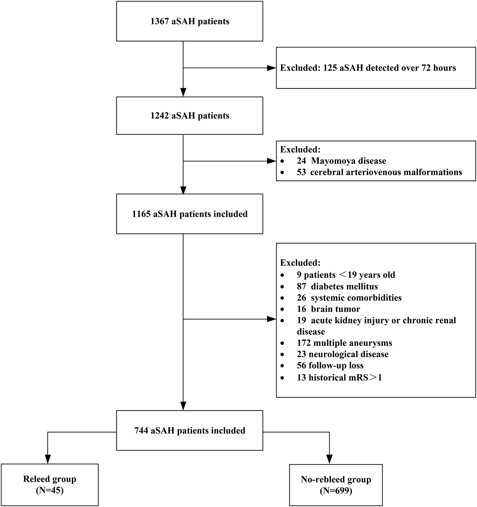 A total of 1,367 patients experiencing aSAH, 744 patients who met the entry criteria in the study [mean age (54.89 ± 11.30) years; 60.50% female patients], of whom 45 (6.05%) developed rebleeding (Table 1 and Figure 1). The time from admission to rebleed was 25 (15.25–35.0) h. A total of 341 patients (45.8%) were in severe clinical condition. A total of 317 patients (42.6%) had severe aSAH on admission. Poor prognosis at 90 days was observed in (18.68%) 139 patients. A total of 744 patients meeting the inclusion criteria were divided into the rebleed group (n = 45) and the non-rebleed group (n = 699).