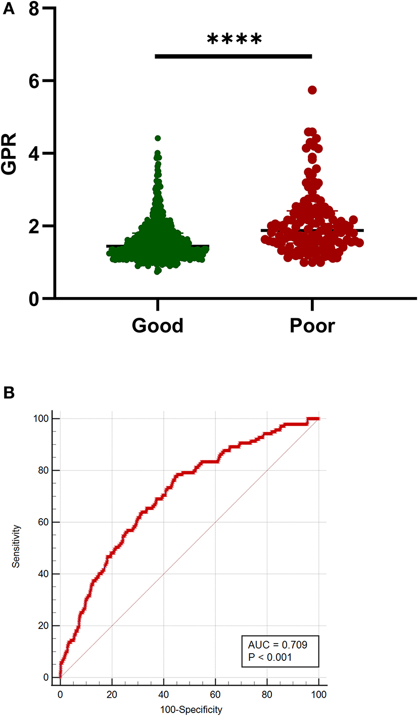 Results: A total of 1,367 patients experiencing aSAH, 744 patients who met the entry criteria in the study [mean age (54.89 ± 11.30) years; 60.50% female patients], of whom 45 (6.05%) developed rebleeding. The patients in the rebleed group had significantly higher GPR levels than those of patients without rebleeding [2.13 (1.56–3.20) vs. 1.49 (1.23–1.87); p < 0.001]. Multivariable analysis revealed that higher mFisher grade and GPR were associated with rebleeding [mFisher grade, odds ratios (OR) 0.361, 95% CI 0.166–0.783, p = 0.01; GPR, OR 0.254, 95% CI 0.13–0.495, p < 0.001]. The receiver operating characteristics (ROCs) analysis described that the suitable cut-off value for GPR as a predictor for rebleeding in patients with aSAH was determined as 2.09 (the area under the curve [AUC] was 0.729, 95% CI 0.696–0.761, p < 0.0001; the sensitivity was 53.33%, and the specificity was 83.98%). Pearson correlation analysis showed a significant positive correlation between GPR and mFisher grade, between GPR and Hunt–Hess grade (mFisher grade r = 0.4271, OR 0.1824, 95% CI 0.3665–0.4842, p < 0.001; Hunt–Hess grade r = 0.4248, OR 0.1836, 95% CI 0.3697–0.4854, p < 0.001). The patients in the poor outcome had significantly higher GPR levels than those of patients in the good outcome [1.87 (1.53–2.42) vs. 1.45 (1.20–1.80); p < 0.001]. Multivariable analysis demonstrated that GPR was an independent predictor for poor prognosis. The AUC of GPR was 0.709 (95% CI 0.675–0.741; p < 0.0001) (sensitivity = 77.70%; specificity = 55.54%) for poor prognosis.