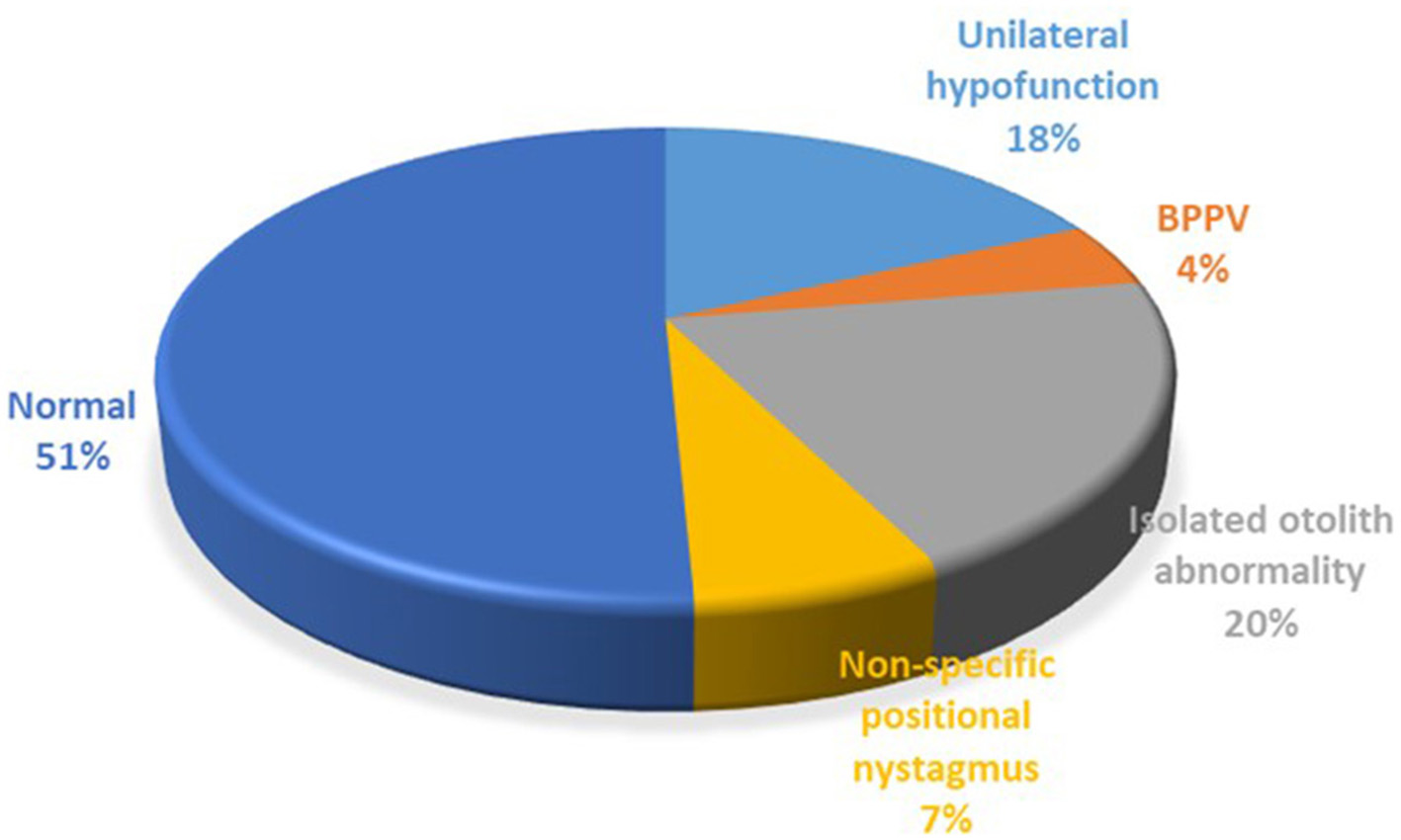 Neuro-otological investigations were performed in 126 patients (Figure 2). The majority of patients had normal results (51%), though there were also many patients with vestibular abnormalities, including a significant number with isolated unilateral otolith abnormalities based on static bias, cVEMP and oVEMP results. Central pathway abnormalities, mostly mild, were found in 6 patients only, and these results did not change the underlying diagnosis of the precipitating condition.