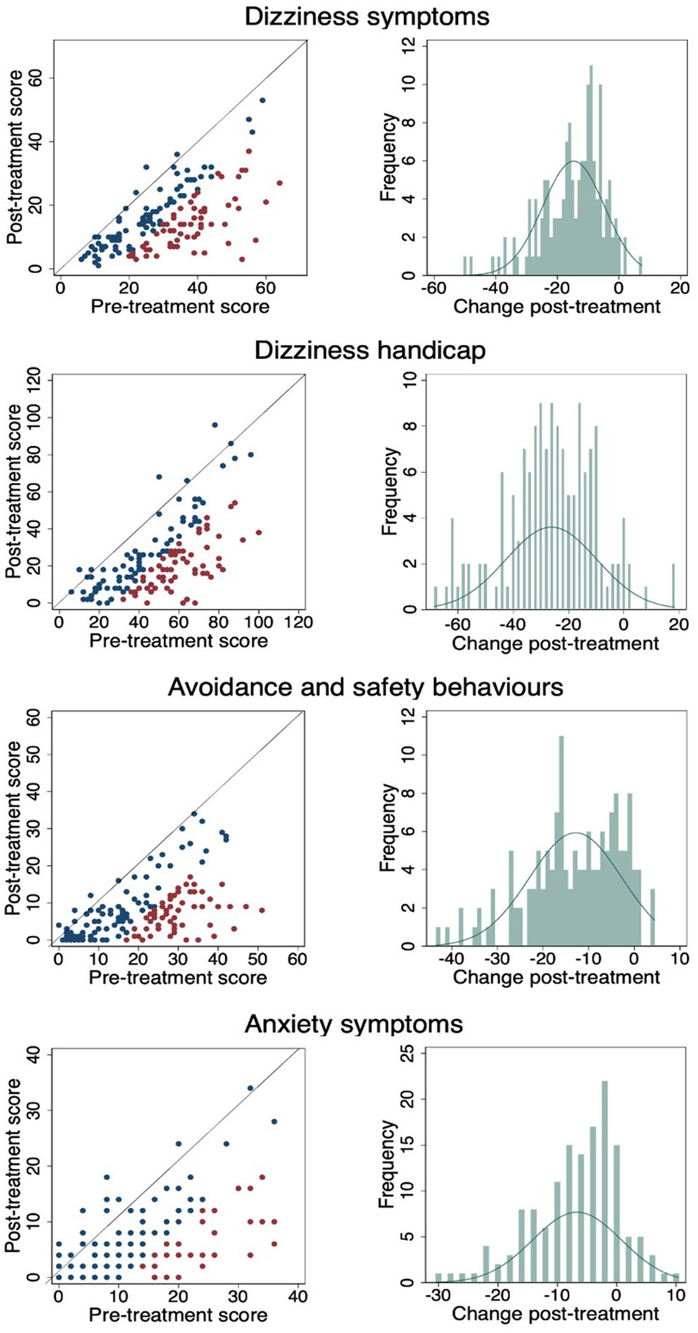 Pre- and post-CBT results and change frequencies for each outcome measure. (Red dots are statistically reliable change, blue dots are non-reliable change and diagonal line represents no change).