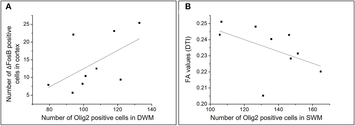 Graphic representations of the analysis of correlations between different numerical variables in the HS group. Scatterplots representing the correlations between the number of ΔFosB positive cells in the cortex and the number of Olig2 positive cells in the DWM (A) and between the number of Olig2 positive cells in the SWM and the mean FA in individuals with HS (B).