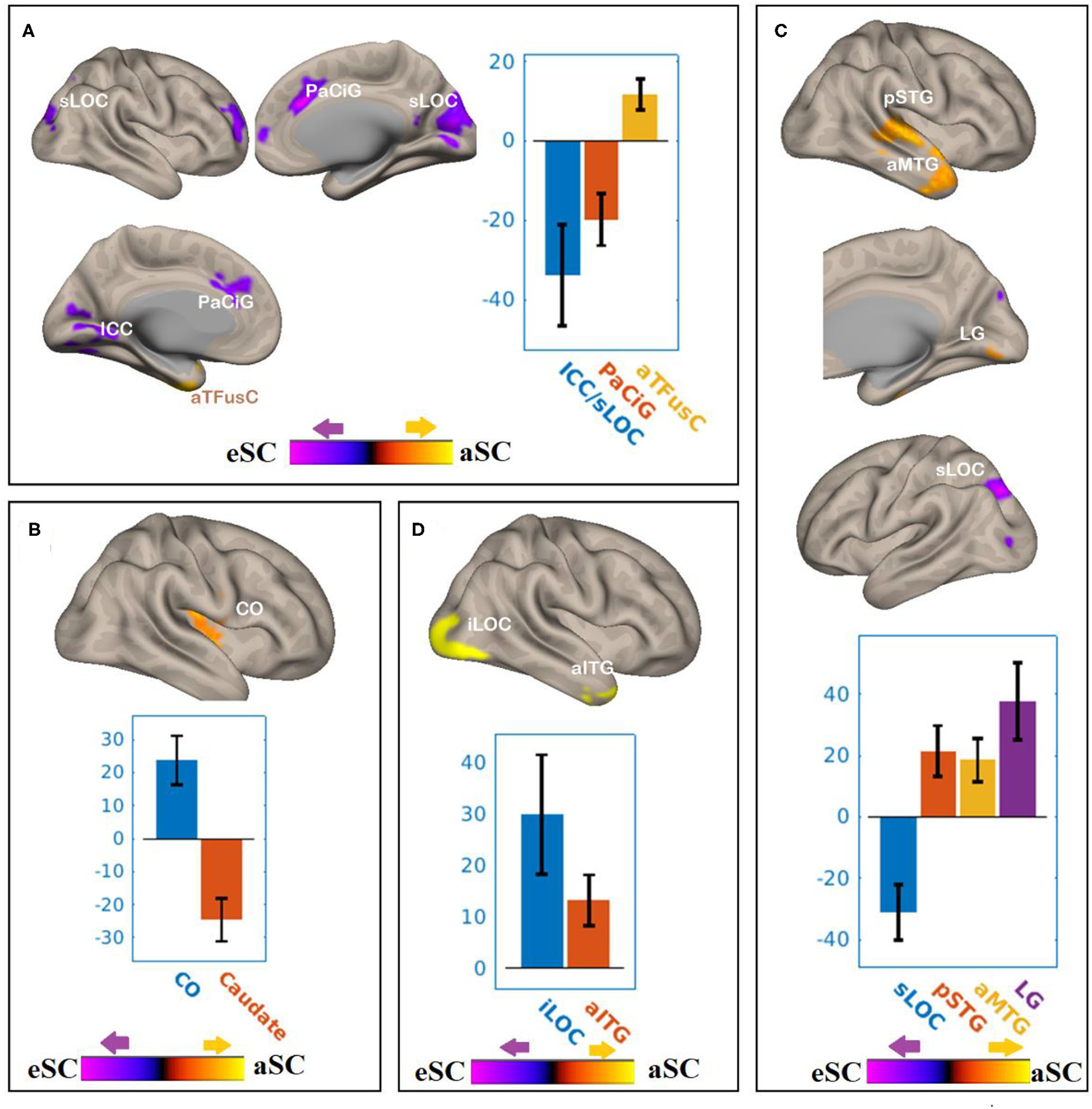 The differences between the younger and older participants in association between the FPN and DAN connectivity the with the FA values of PCR under the influence of the allocentric and egocentric task effects. (A) PCR–FEF for aSC > eSC. (B) PCR–IPS for aSC > eSC. (C) PCR–LPFC for aSC > eSC. (D) PCR–PPC for aSC > eSC. The connectivity blobs are thresholded and cluster-level corrected using FDR for multiple comparison at p = 0.05. Color bar coding: Violet represents an increased (positive) and reduced (negative) in functional connectivity for the eSC and aSC condition, respectively, whereas the hot represents an increased (positive) and reduced (negative) in functional connectivity for the aSC and eSC condition, respectively. sLOC, superior division of lateral occipital cortex; ICC, intracalcarine cortex; PaCiG, Para-cingulate gyrus; CO, central opercular cortex; pSTG, posterior division of superior temporal gyrus; aMTG, anterior division of middle temporal gyrus; LG, lingual gyrus; iLOC, inferior division of lateral occipital cortex.