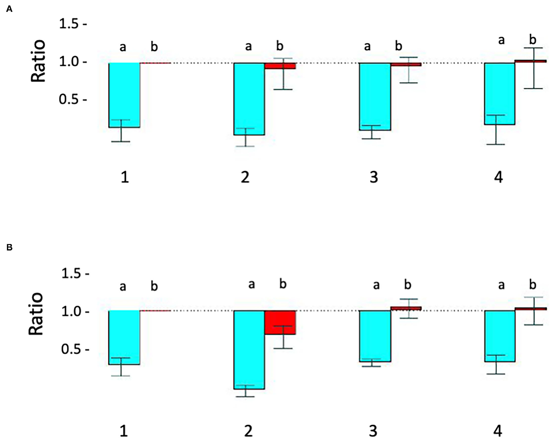 Relative quantitative –PCR [Q-PCR] confirms STXBP1 deletion in proband 1 and demonstrates that it is de novo. (A) Q-PCR product using primer pair 1 (intron 1) did not detect the deletion in the proband 1 (#2), his parents (#3-mother, #4-father) and a pooled normal male sample control (#1). (B) With primer 2 (intron 19), Q-PCR product confirmed the STXBP1 deletion in proband 1 (#2b) detected by microarray. No deletion was detected in the proband's mother (#3) and father (#4) or the control (#1). a = target/reference ratio (i.e., STXBP1/FOXP2); b = normalized ratio (i.e., = proband's a/normal controls a, mother's a/controls a and father's a/controls a). Error bars indicate average standard error of the mean obtained from normalization of triplicates for each sample. The test was reproducible and was repeated more than three times.