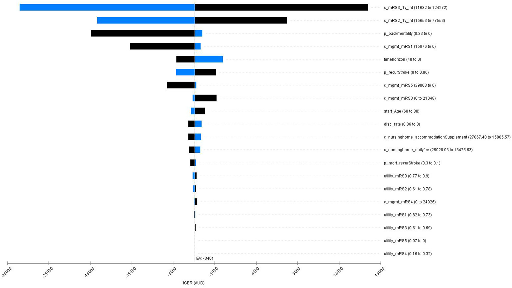 One-way deterministic sensitivity analyses were conducted by varying one model parameter at a time within a plausible range to examine the robustness of base case results (Table 1). The results of a range of individual deterministic sensitivity analyses are combined and presented in the form of a tornado diagram (i.e., by showing the range of change in ICER). The probabilistic sensitivity analyses (PSAs), which determined the distribution of key uncertain parameters, were run to further explore the results. Additionally, the mRS outcomes at 1 year for the participants of the stroke telemedicine program were tested with a Dirichlet distribution. The Australian Telestroke Network study informed the distribution of the cost related to the stroke telemedicine program delivery (Supplementary Table 2). A key assumption made in the PSA was that the distributions for each parameter were not correlated (i.e., the variation in one parameter was not associated with the change in another parameter). An incremental cost-effectiveness plane was generated to illustrate the results of the PSA.