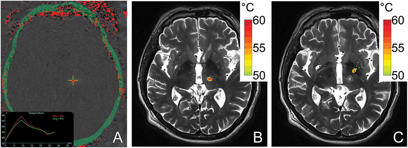 Simulated temperature maps for both VIM (Figure 4B) and GPi (Figure 4C) ablation on a single ET patient with the same sonication duration and power were rendered. The estimated peak temperature was 59.8 °C and 57.8 °C at the VIM and GPi targets, respectively. On the VIM target, the simulated peak temperature was quite close to the peak temperature (59.8 °C) recorded by MR thermometry (Figure 4A) during the treatment under the same conditions.