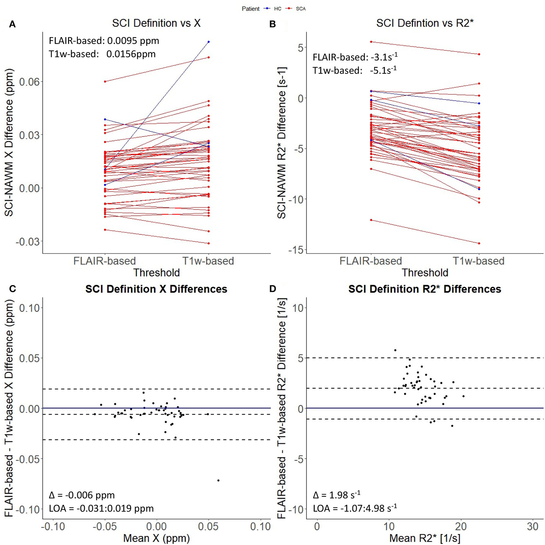 Effect of SCI definition on SCI-NAWM χ and R. (A) Comparison of mean silent cerebral infarct (SCI) and normal appearing white matter (NAWM) susceptibility (χ) differences before and after the application of the more stringent T1w-based threshold. (B) Comparison of mean SCI-NAWM R2* differences before and after application of the T1w-based threshold. Mean SCI-NAWM χ and R differences for the two definitions are shows in (A,B) respectively. (C) Bland-Altman analysis of mean SCI-NAWM χ differences before and after application of the T1w-based threshold. The mean bias (Δ) and limits of agreement (LOA) are annotated within the plot. (D) Bland-Altman analysis of the mean SCI-NAWM R differences.