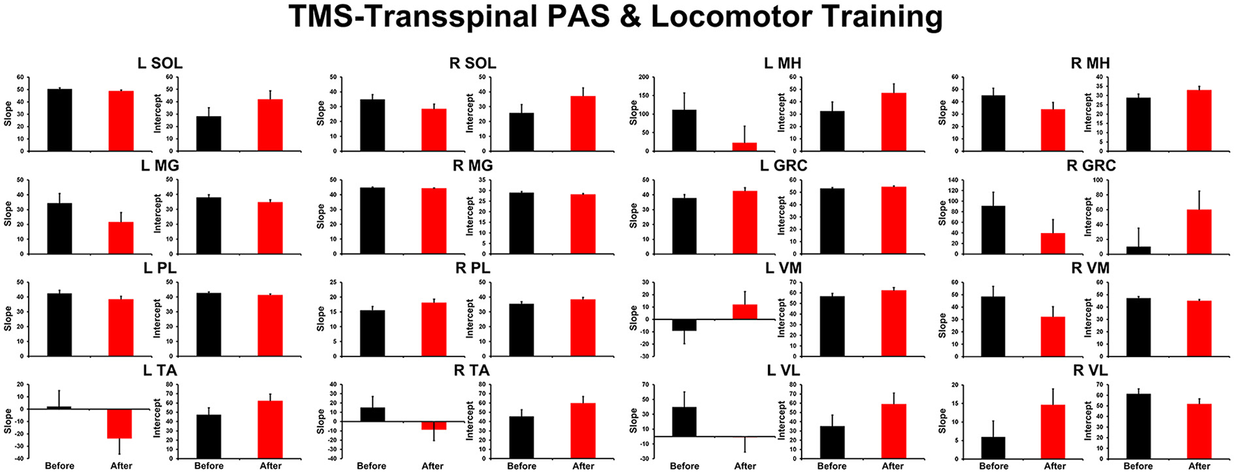 Overall amplitude of slope and intercept for TEPs recorded from left and right leg muscles. For each subject and muscle, a linear regression was applied to the normalized TEP amplitude plotted against the homonymous background EMG activity before and after transspinal-TMS PAS and locomotor training. An asterisk indicates a significant difference before and after intervention. Error bars indicate the SEM. PAS, paired associative stimulation; TEPs, transspinal evoked potentials.
