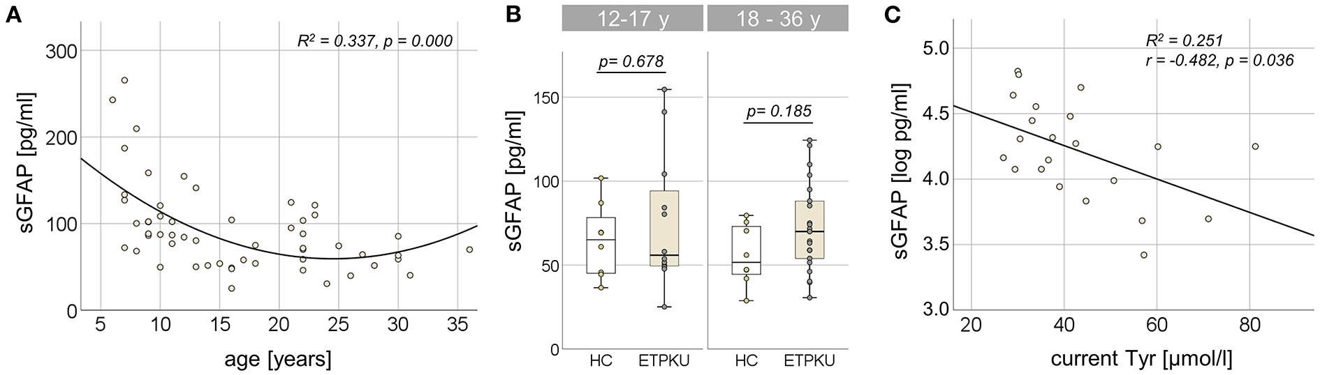 Serum glial fibrillary acidic protein (sGFAP) in early treated phenylketonurie (ETPKU) patients. (A) Association of sGFAP concentrations and age. The quadratic relationship between sGFAP concentrations and age is depicted by the continuous line. (B) sGFAP concentrations in ETPKU 12-17 (N = 12) and 18-36 (N = 22) years of age compared to healthy controls (HC; N = 8 / 8). (C) Association of natural log-transformed sGFAP concentrations in adult ETPKU (N = 22) and current concentrations of tyrosine (Tyr) in plasma. The relationship of the variables was linear, as depicted by the continuous line.