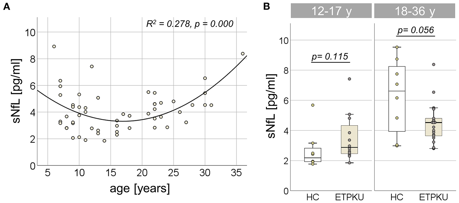 For two reasons, correlation and regression analyses were performed only for the group of ETPKU patients 18–36 years of age (N = 22): (i) as expected from the literature (54), sGFAP and sNfL concentrations were not associated with age in this cohort, (ii) documentation of Phe levels from childhood, adolescence, and adulthood was available.