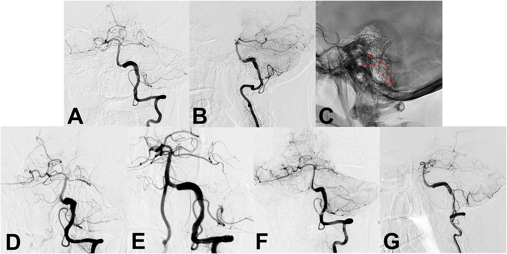 (A,B) Preoperative angiography shows an unruptured vertebral artery fusiform aneurysm. (C) Intraoperative angiography shows the successful placement of a single conventional stent (lines). (D,E) Angiography immediately after stent placement showed residual flow inside the aneurysm. (F,G) Follow-up angiography 6 months after the procedure continued to show residual aneurysm.