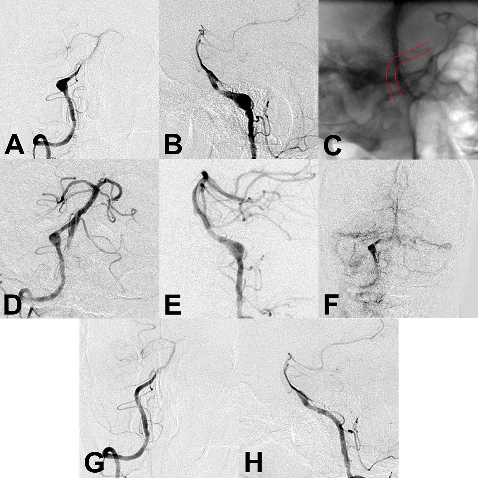 (A,B) Preoperative angiography showed an unruptured vertebral artery fusiform aneurysm. (C) Intraoperative angiography showed successful deployment of a flow diverter stent (lines). (D–F) Angiography immediately after the procedure showed a residual aneurysm with significant stasis. (G,H) Follow-up angiography 6 months after the procedure showed complete aneurysm obliteration.