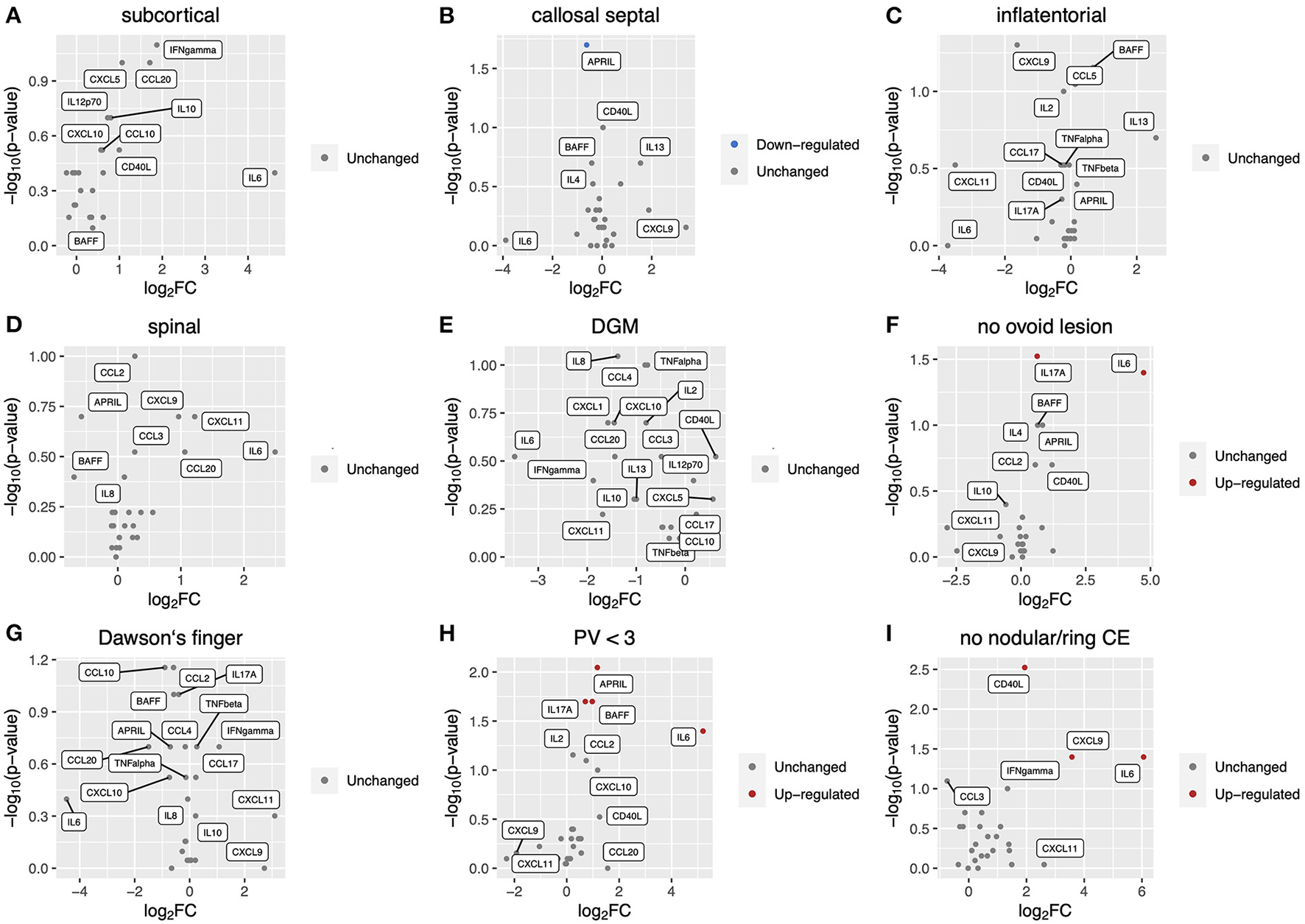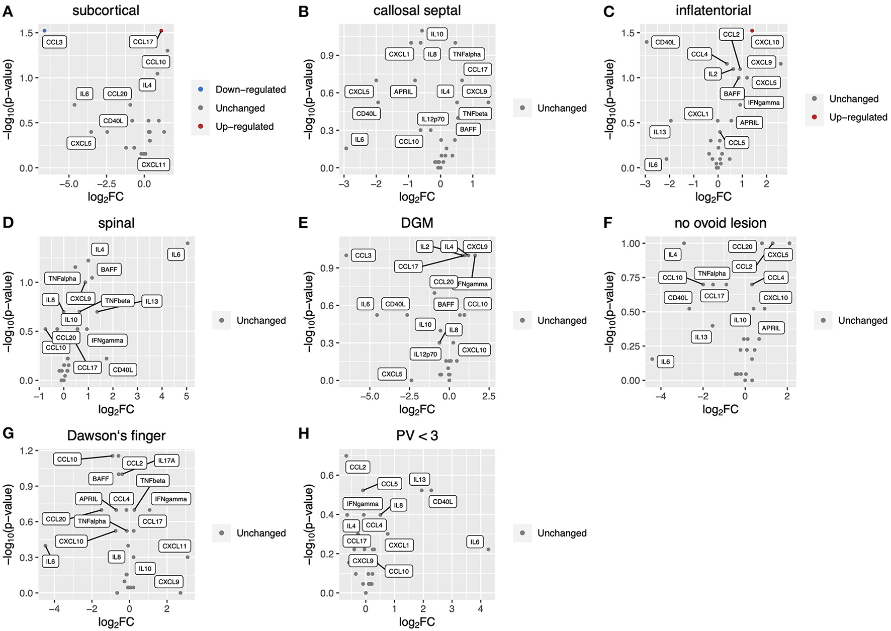 Correlation of CSF inflammatory profile with radiological findings at MS diagnosis. Volcano plot showing log2 (fold change, FC) against –log10 (p-value) of CSF inflammatory profile based on radiological findings as follows: (A), subcortical lesion; (B), callosal septal lesion; (C), inflatentorial lesion; (D), spinal lesion; (E), DGM lesion; (F), no ovoid lesion; (G), Dawson‘s finger; (H), less than three PV. Red or blue indicates elevation or reduction, respectively, of cytokine/chemokine levels with a significant FC (|FC| > 1.5) and p-value (< 0.05). CSF, cerebrospinal fluid; MS, multiple sclerosis; DGM, deep gray matter lesion; PV, periventricular lesions; CE, contrast-enhancing.