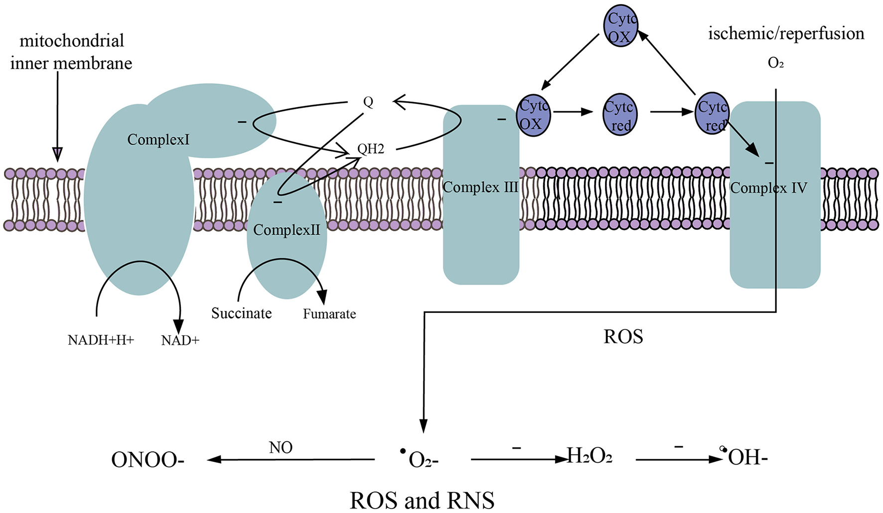 Generation of ROS and RNS. (1) NADH oxidation respiratory chain. NADH-H+ transfers electrons to complex I and is oxidized to NAD+. (2) Succinate oxidation respiratory chain. Succinate transfers electrons to complex II and is oxidized to fumarate. (3) The electrons in complex I/II are captured by ubiquinone (Q) to form QH2. The electrons in QH2 are transferred to complex III, then QH2 that loses electrons becomes Q to participate in the electron transfer again. Electrons in complex III are transferred to complex IV via cytochrome c (Cytc). (4) O2 obtains electrons from complex IV to generate ROS. (5) After ischemic/reperfusion injury, O2 gets a single electron to generate superoxide anion (.), . accepts a single electron to generate hydrogen peroxide (H2O2), and H2O2 accepts a single electron to be reduced to hydroxyl radical (.OH−), . can rapidly oxidize NO to produce nitrite (ONOO−).