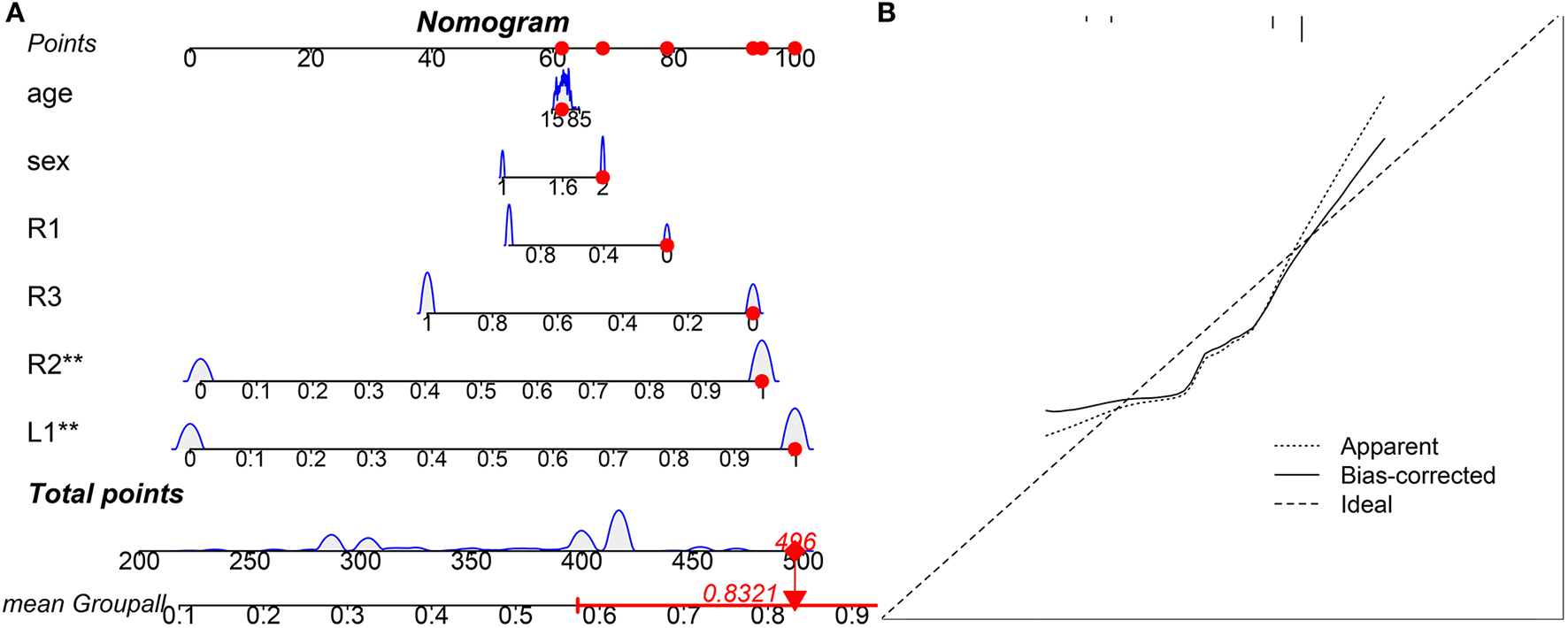 Visual competing risk-nomogram tool for individual prediction of insomnia. The TrackPoint shows an example of one subject for his/her point score and corresponding risk of development of insomnia. For this subject, his/her total point score is 496, and the corresponding risk of development of insomnia is 83.21%. (A) Competing-risk nomogram; (B) Agreement calibration curve.