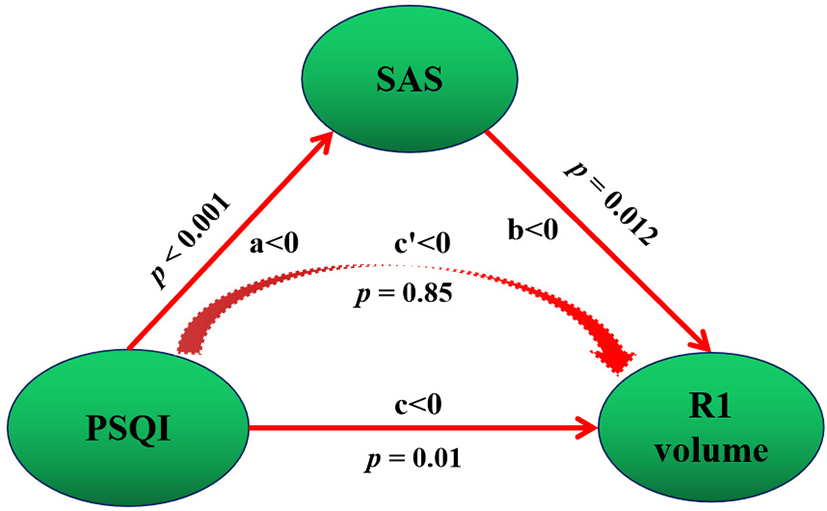 Mediation association of post-insomnia negative emotion, insomnia severity, and hippocampal atrophy. Negative emotion refers to SAS. PSQI refers to insomnia severity. Total PSQI score was negatively correlated with R1 volume, which indicates a positive correlation with R1 volume atrophy. SAS score was negative acting in the causal path of PSQI leading to R1 volume, that is, SAS score was positive acting in the causal path of PSQI leading to R1 volume atrophy. Positive and negative mediation acting was determined by the value of c and c′. In our study, c′ < 0, this means a negative mediation acting in the causal path of PSQI leading to R1 volume increase. This is, a positive acting in the causal path of insomnia severity (PSQI score) leading to R1 atrophy (negative c′ < 0 and R1 volume increase = positive acting to R1 atrophy). a, the direct effect from PSQI to SAS; b, the direct effect from SAS to R1 volume; c, the direct effect from PSQI to R1 volume. p, p value for the mediation effect.