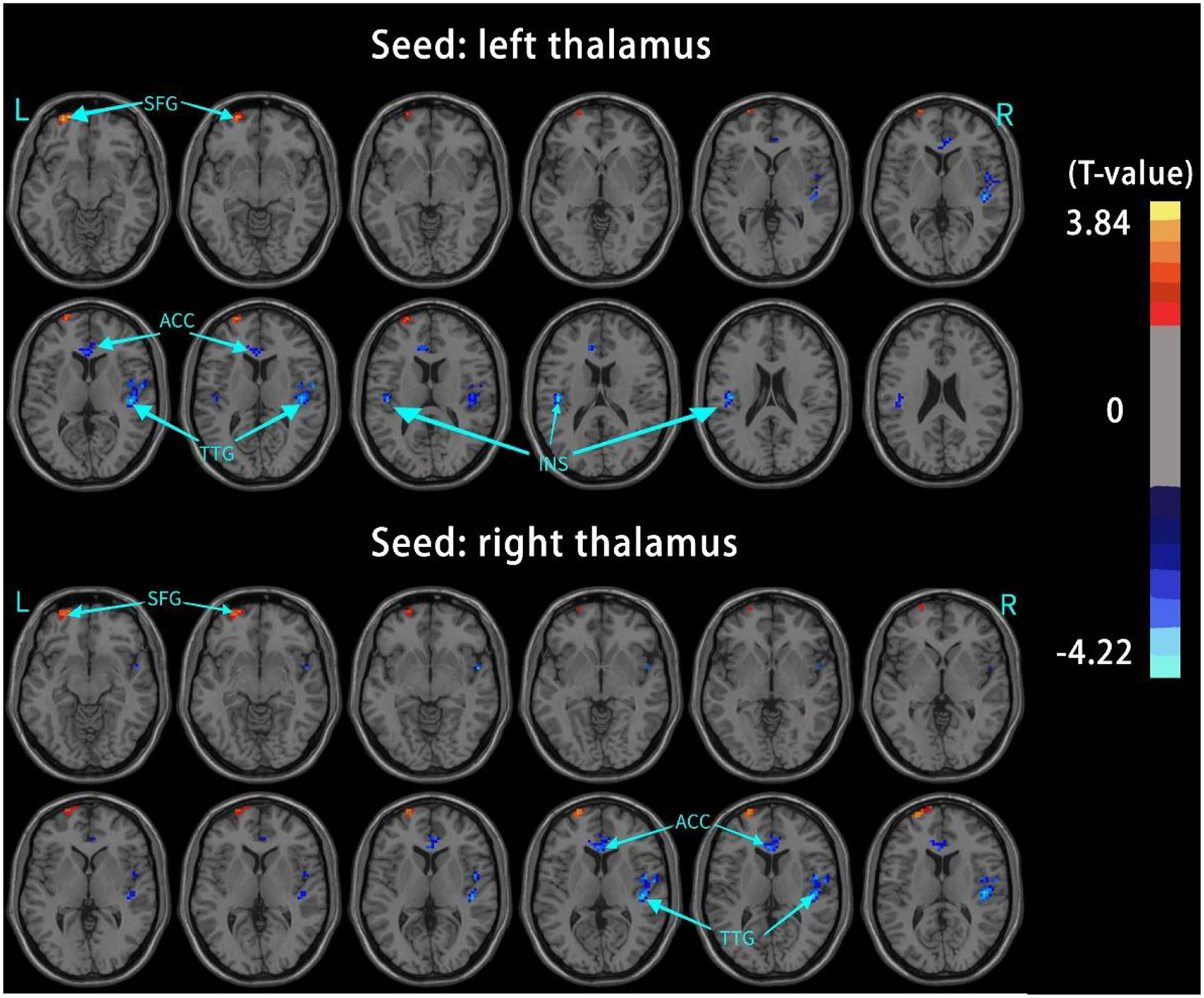 Brain regions with significant changes in the rs-FC of the bilateral thalamus (voxel-level P < 0.05, AlphaSim corrected), visualized with the DPABI slice viewer (http://rfmri.org/dpabi). Significant group differences in the mean weighted rs-FC in the above regions (P < 0.05). TTG, transverse temporal gyrus; ACC, anterior cingulate cortex; INS, insula; SFG, superior frontal gyrus.