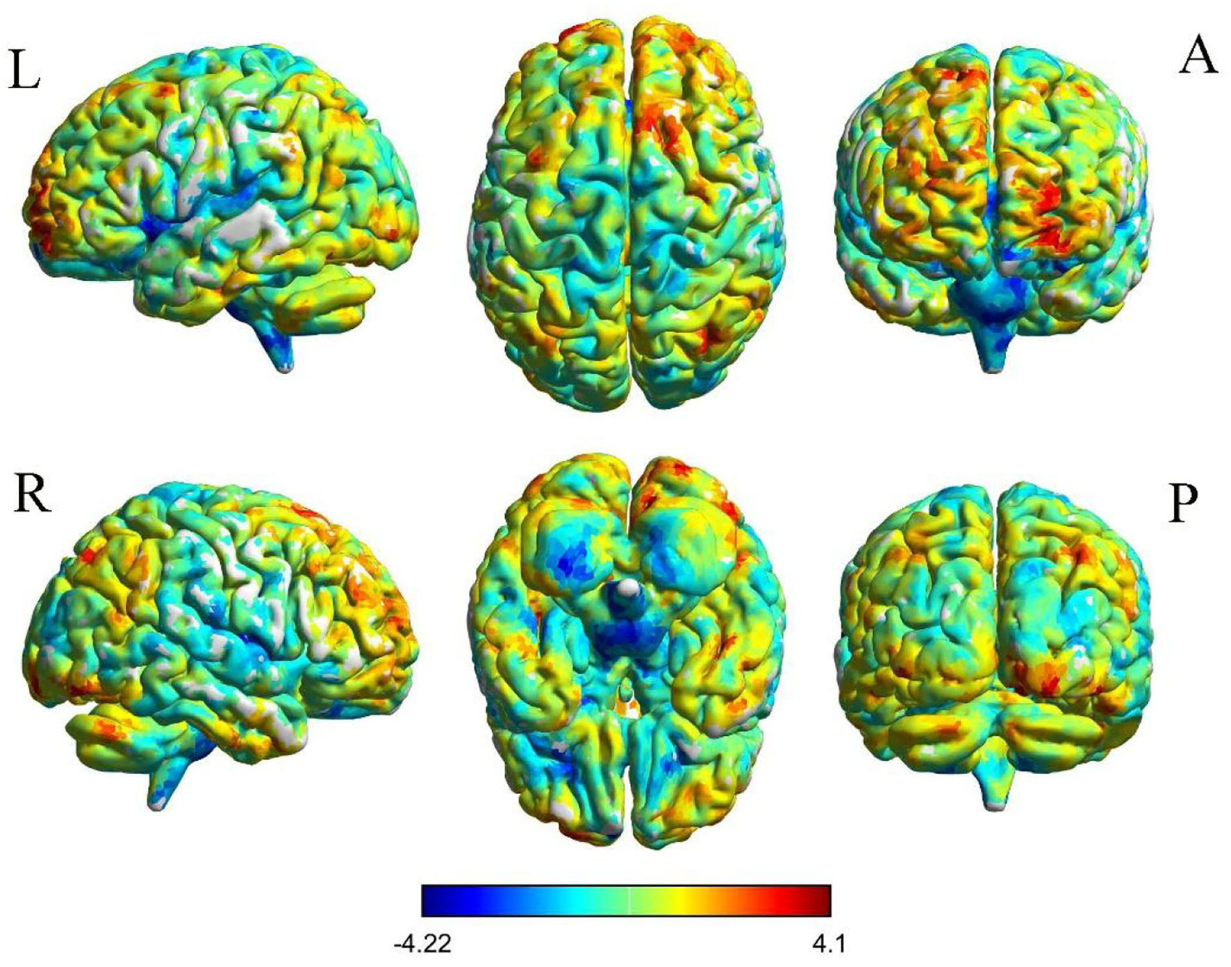 Voxelwise comparison of FC between participants in the PACG and HC groups based on the left thalamus seed (voxel-level P < 0.05, AlphaSim corrected). Color bars indicate t-scores; warm colors indicate areas where the FC value in PACG is greater than that in HCs, while cold colors indicate the opposite.