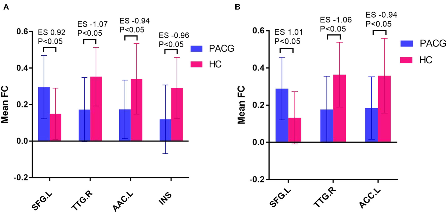 Mean weighted FC values of HCs and PACG patients in altered regional brain areas based on the left thalamus seed (A).and right thalamus seed (B). FC, functional connectivity; PACG, primary angle-closure glaucoma; HCs, healthy controls; TTG, transverse temporal gyrus; ACC, anterior cingulate cortex; INS, insula; SFG, superior frontal gyrus; ES, effect size; L, Left; R, Right.