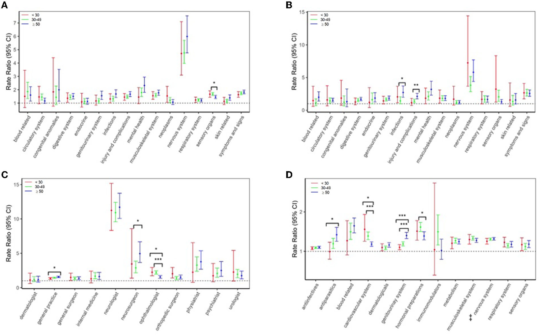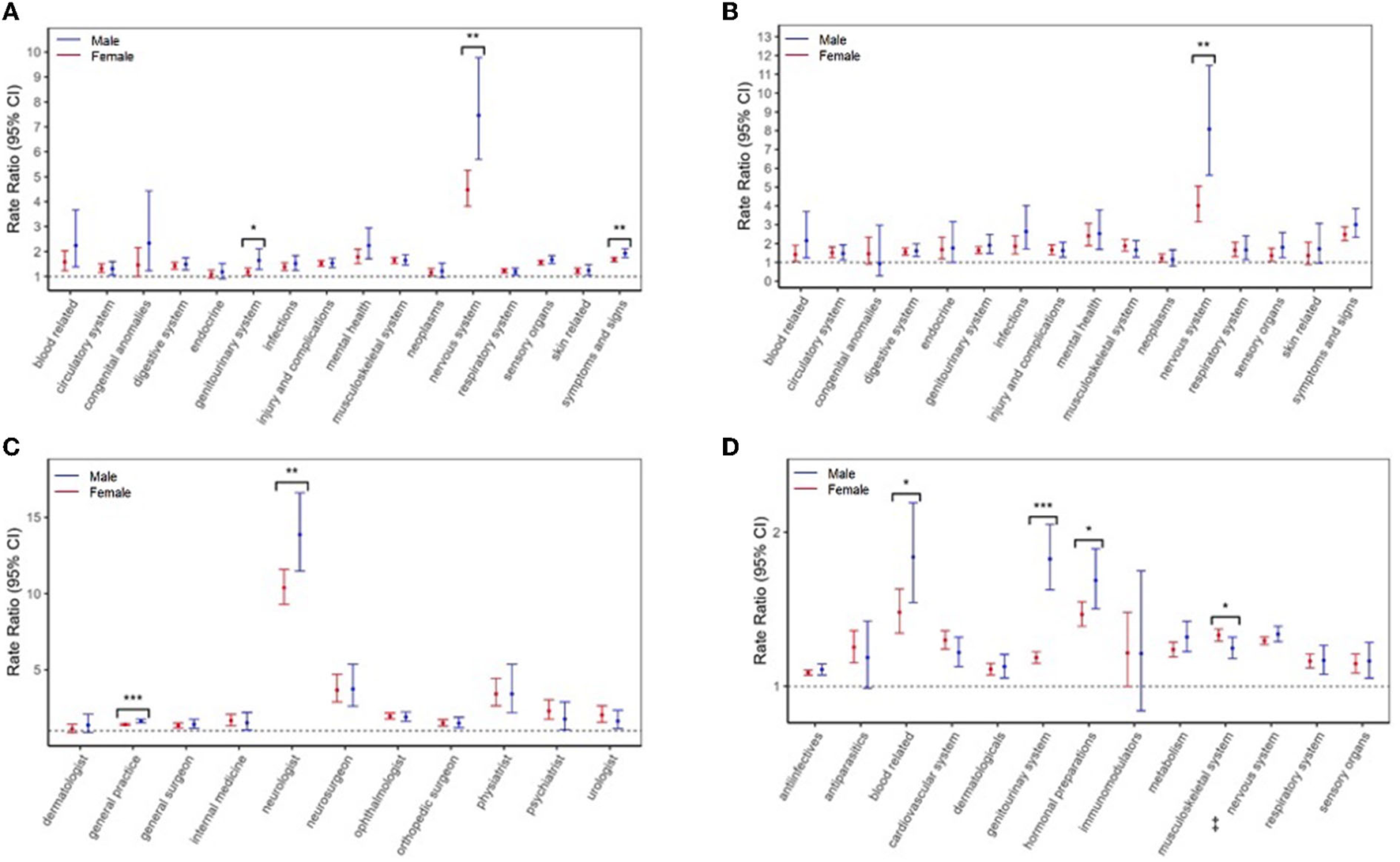 Multiple sclerosis (MS) cases vs. controls in the 5 years before the first demyelinating diagnostic code: sex-specific rate ratios for (A) physician visits and (B) hospitalizations per International Classification of Diseases-9/10 chapter, (C) physician visits per specialty, and (D) prescriptions-filled per Anatomical Therapeutic Chemical (ATC) level 1 classification. Results were not reported if a model failed to converge due to low counts or the 95% CIs were wide (exceeded 100). *P < 0.05, **P < 0.01, *** P < 0.001 indicates that the rate ratios were statistically different between men and women, based likelihood ratio tests. ‡Amantadine was categorized as a nervous system drug, based on the Anatomical Therapeutic Chemical (ATC) level I classification system.