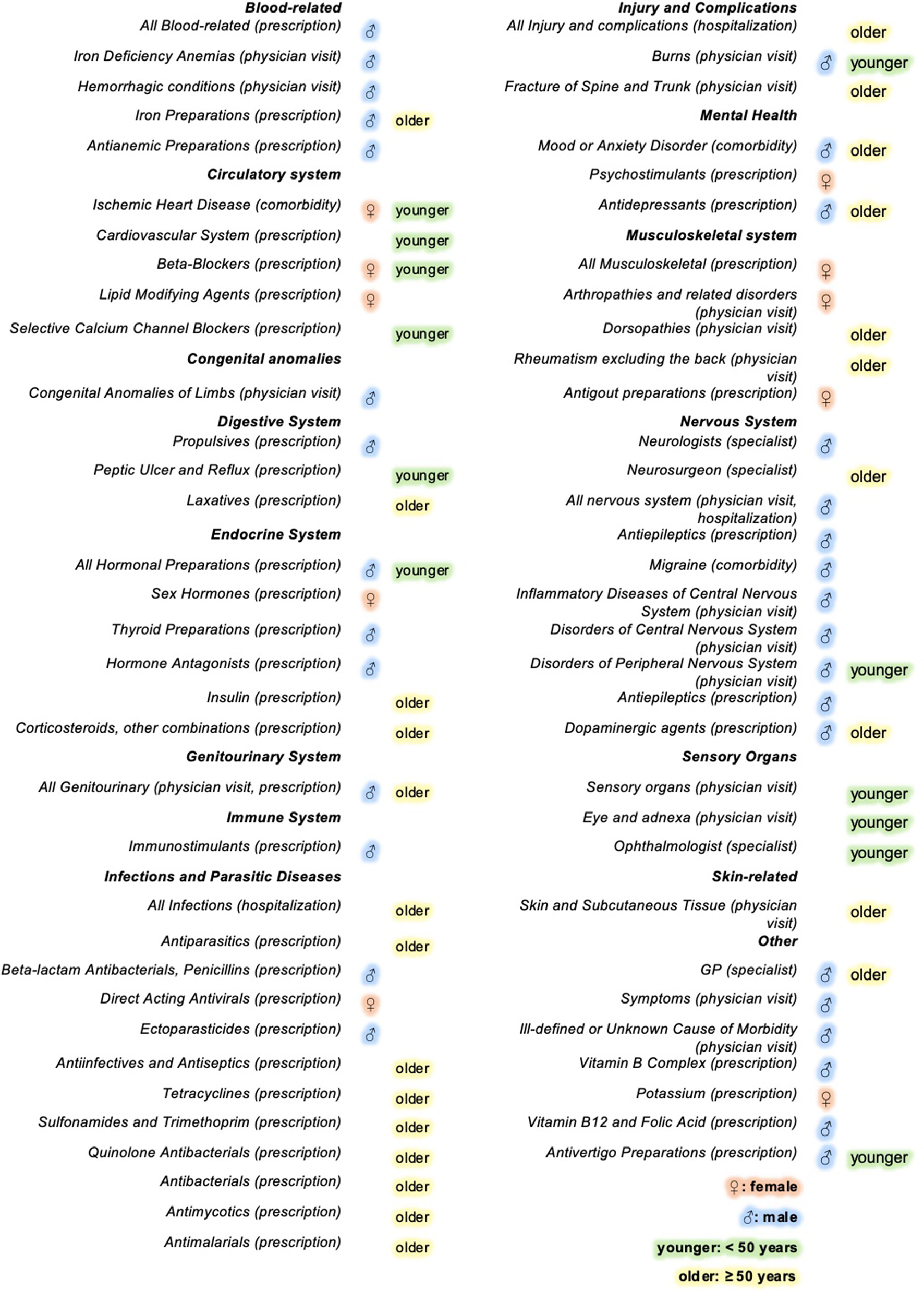 In the administrative cohort, males with MS had a higher relative rate for genitourinary-related visits (males: adjusted Rate Ratio (aRR) = 1.65, females: aRR = 1.19, likelihood ratio test P = 0.02) and antivertigo prescriptions (males: aRR = 4.72, females: aRR = 3.01 P < 0.01). Injury and infection-related hospitalizations were relatively more frequent for ≥50-year-olds (injuries < 30/30–49/≥50: aRR = 1.16/1.39/2.12, P < 0.01; infections 30–49/≥50: aRR = 1.43/2.72, P = 0.03), while sensory-related visits and cardiovascular prescriptions were relatively more common in younger persons (sensory 30–49/≥50: aRR = 1.67/1.45, P = 0.03; cardiovascular < 30/30–49/≥50: aRR = 1.56/1.39/1.18, P < 0.01). General practitioner visits were relatively more frequent in males (males: aRR = 1.63, females: aRR = 1.40, P < 0.01) and ≥50-year-olds (< 30/≥50: aRR = 1.32/1.55, P = 0.02), while differences in ophthalmologist visits were disproportionally larger among younger persons, < 50-years-old (< 30/30–49/≥50: aRR = 2.25/2.20/1.55, P < 0.01). None of the sex and age-related differences in the smaller clinical cohort reached significance (P ≥ 0.05).
