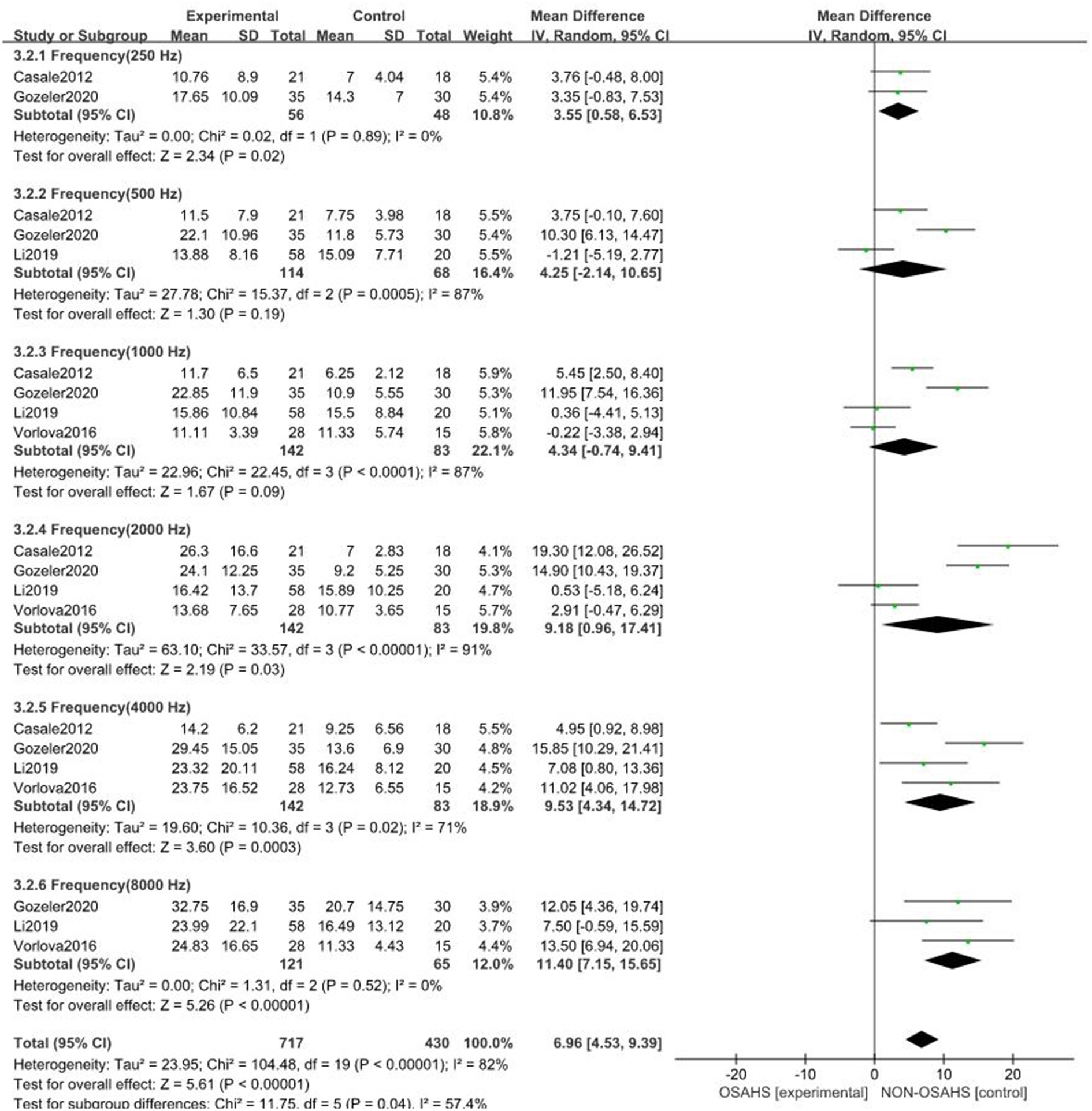 In conclusion, the pure-tone hearing thresholds at 250, 2,000, 4,000, and 8,000 Hz in OSAHS patients were higher than those of the control group. After subgroup analysis, the heterogeneity of the pure-tone hearing threshold correlation between the OSAHS group and control group was reduced, especially at 4,000 and 8,000 Hz, suggesting that hearing tests of different frequencies may be the source of heterogeneity.