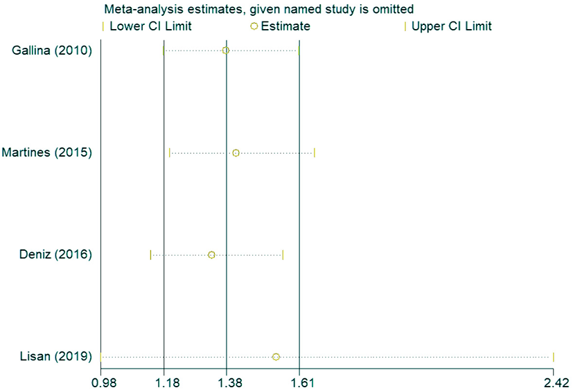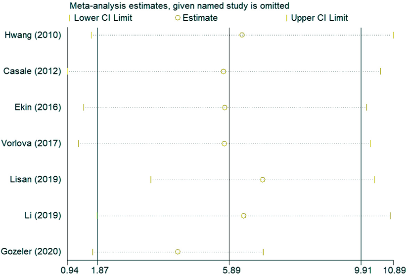 In the sensitivity analysis of the incidence of hearing loss in the OASHS group and control group (Figure 5), the pooled results and cross-study heterogeneity were not significantly changed after excluding any single study. In the sensitivity analysis of the pure-tone hearing threshold in the OASHS group and control group (Figure 6), the combined results and cross-study heterogeneity also did not change significantly after excluding any single study.