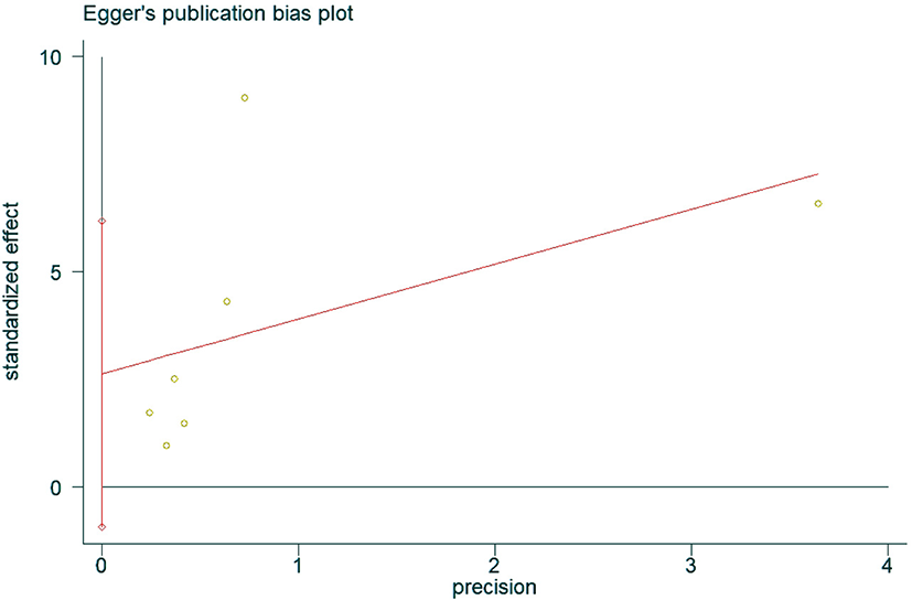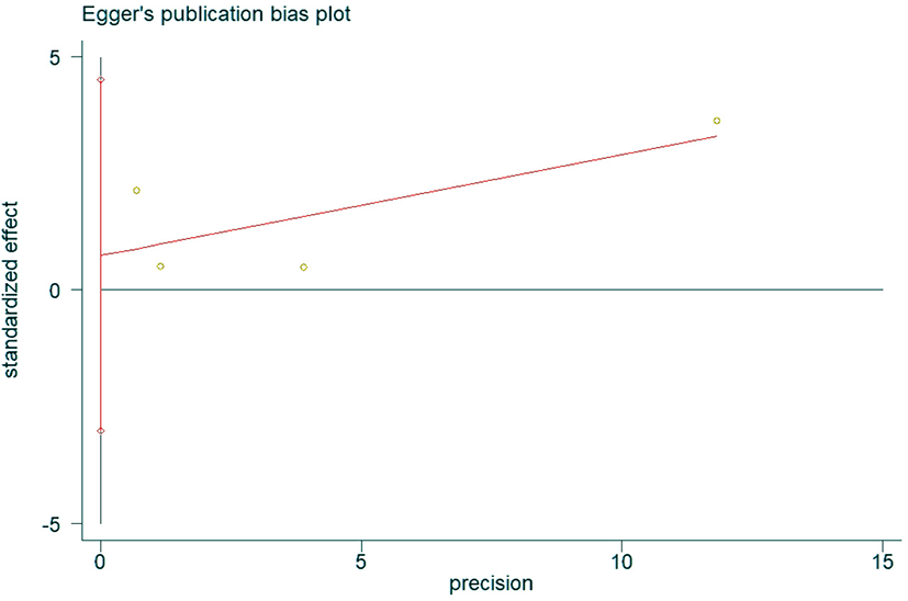 The presence of publication bias was assessed using Egger's method. There were four studies on the incidence of hearing loss in the OASHS group and control group. The result of Egger's method (Figure 7) was P = 0.488 > 0.05, indicating no significant publication bias. There were seven studies on the pure-tone hearing threshold between the OASHS group and the control group. The result of Egger's method (Figure 8) was P = 0.115 > 0.05, indicating no significant publication bias.