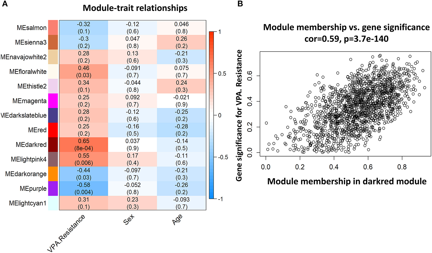 Representative heat map of modules-traits relationship and analysis of gene significance and module membership in the darkred module. (A) The heat map showed the relationship between different modules and each trait (VPA resistance, sex, or age). The number in each bar denoted the correlation coefficient and p-value. The darkred module is most related to VPA resistance. (B) Scatter diagram to show the gene significance in VPA resistance and module membership in the darkred module (VPA, valproate).