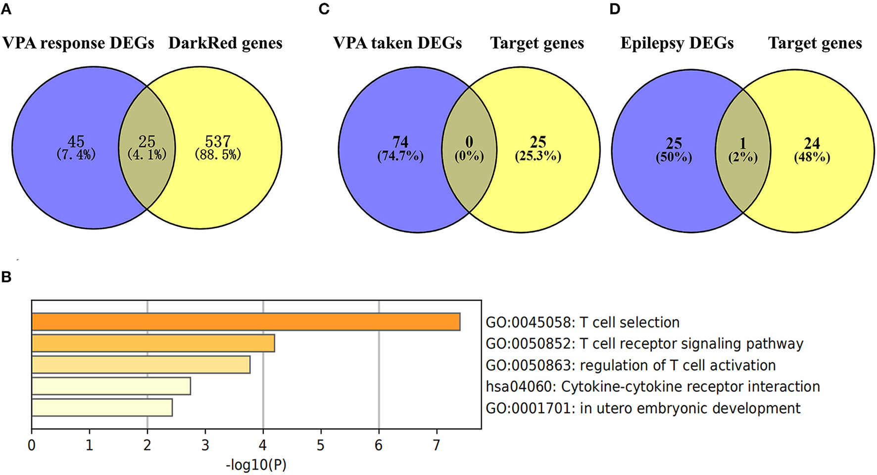 All genes in the GSE143272 were divided into 24 different modules. Among these modules, the darkred module showed a pivotal correlation with VPA resistance. A total of 70 DEGs between VPA-responsive and VPA-resistant patients were identified. After taking the intersection, 25 target genes were obtained. The 25 target genes were significantly enriched in T cell receptor recognition, T cell receptor signaling pathway, regulation of T cell activation, cytokine–cytokine receptor interaction, and in utero embryonic development. Half of the target genes (CD3D, CD3G, CXCR3, CXCR6, GATA3, GZMK, IL7R, LIME1, SIRPG, THEMIS, TRAT1, and ZNF683) were directly involved in the T cell development, migration, and activation signaling pathway.
