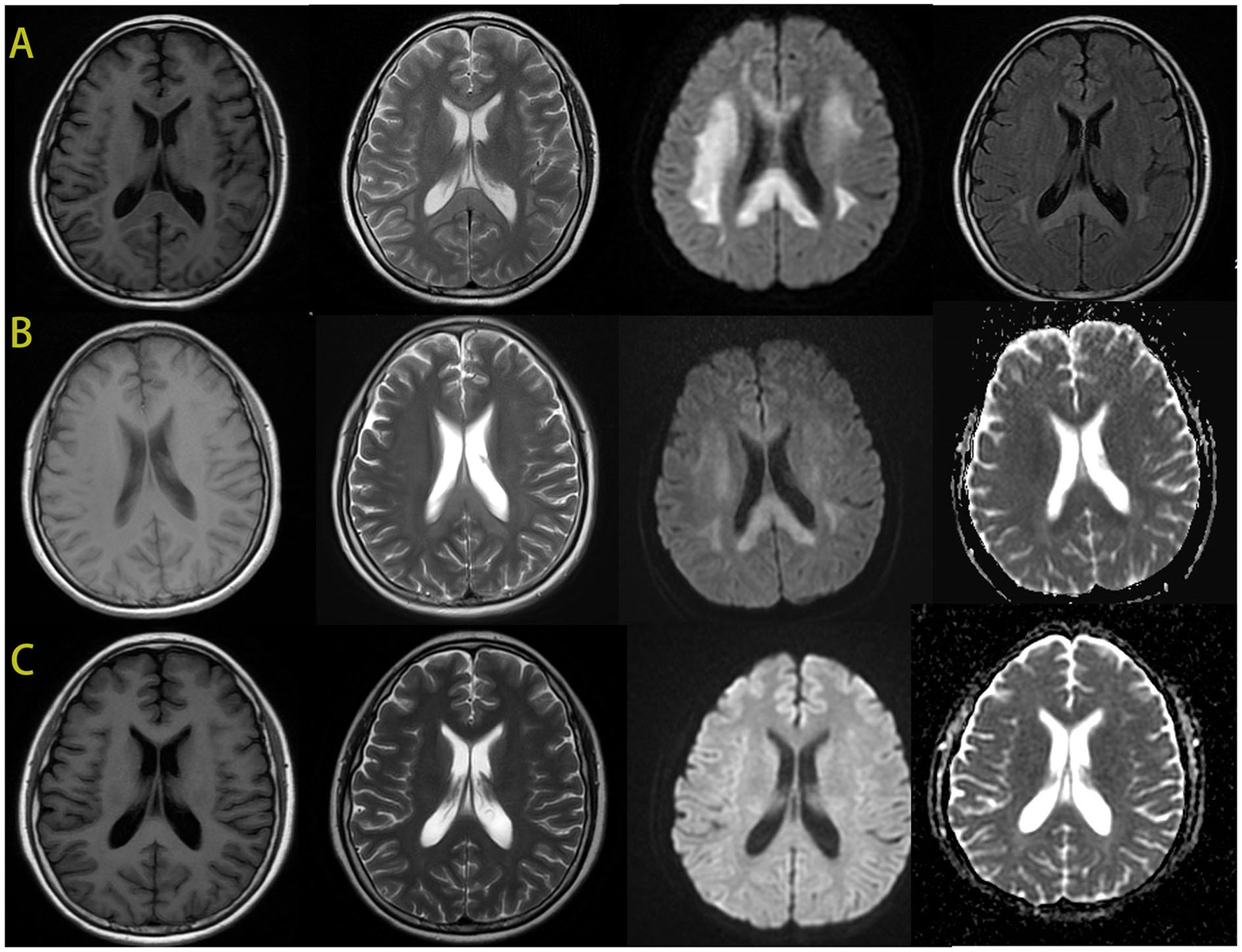 The brain MRI images of the patient. During the episode, the brain MRI showed hypointense signal in T1-weighted imaging and hyperintensity in T2-weighted imaging in the bilateral deep white matter and the corpus callosum. And there was an obviously bilaterally symmetric hyperintense DWI signal in the same region (A). MRI after 4 days showed improvement of the abnormal signal in white matter, the hypointense ADC signal in the same region (B). After 1 month, the images of her brain were almost normal (C).