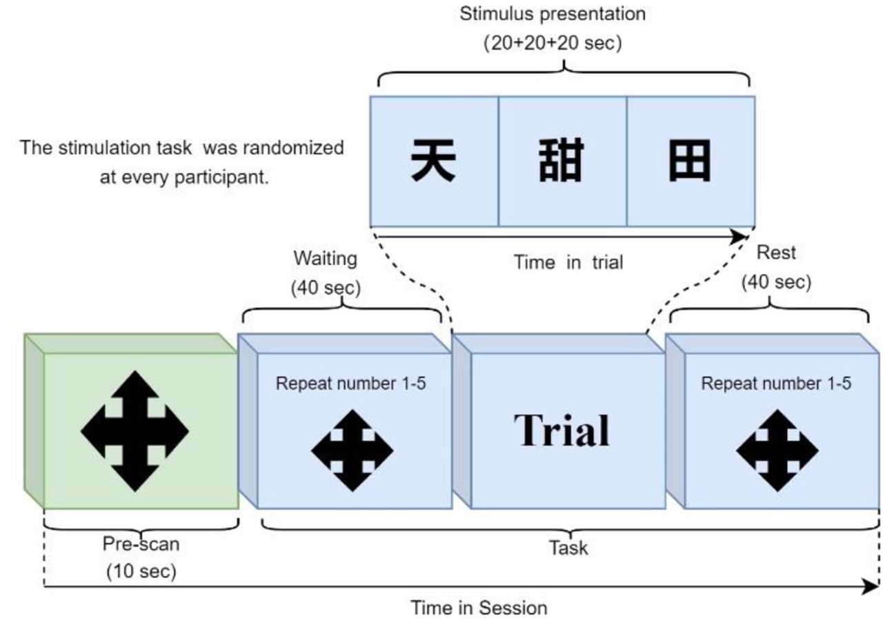 The fNIRS data were acquired via the ETG-4000 Optical Topography system. The mode was continuous wave technology, and the changing trend of oxy-Hb concentration was measured. The acquisition frequency of the fNIRS signal was 10 Hz, and the measuring depth was 2.0–3.0 cm. During the experiment, all participants fixated on the screen to perform the verbal fluency (VFT) task (Figure 1). Before measuring fNIRS signals, an introduction and exercises for the VFT task were preceded to ensure participants fully understood the task. After the introduction and exercises, each participant performed a VFT task session. The session consisted of three trials. Trials consisted of three different characters with the same pronunciation (20s / a Chinese character). Record the reaction time and operation accuracy of all participants for data analysis.