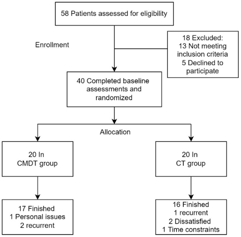 There were two groups in the study, the CMDT group, and the CT group. We used G*Power software 3.1 prior power analysis to estimate the sample size (α = 0.05, and 1 – β = 0.8). No previous randomized trial had examined the effect of CMDT training on cognitive function in PSCI. We chose an effect size of 0.4, and the calculated minimum sample size was 34 cases. Assuming that the drop-off rate of the whole experiment was 10%, the total sample size was calculated to be 38 patients with PSCI. The patients were randomly divided into two groups with a 1:1 ratio, and the final number of patients in each group should be 19. Finally, a total of 33 participants in the CMDT group and CT group were included in our study because seven patients dropped out during the study.