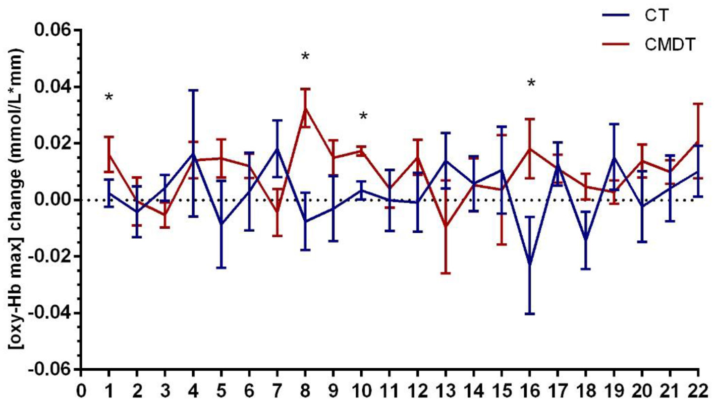 | oxy-Hb max (mmol/L*mm) | CMDT | 0.0092 | −0.937 | P = 0.349 |