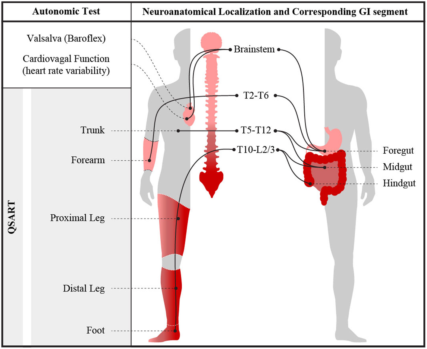Despite the heterogenous, multisystem nature of AN symptoms, the organization of the ANS provides a framework to facilitate localization of end organ (visceral) dysfunction based on its known neuroanatomical structure (4, 38, 39). For example, damage to autonomic pathways within the spinal cord, such as in multiple sclerosis or spinal cord trauma, has shown corresponding segmental GI dysmotility at the level of the lesion (40). Unfortunately, direct, objective diagnostic tests for enteric neuropathy are not routinely available clinically, and prior reports note a discordance between GI symptoms and objective motility dysfunction (5). One potential opportunity is to utilize existing, standardized autonomic testing as a surrogate to assess the functional integrity of neural pathways that also influence gut function (5).