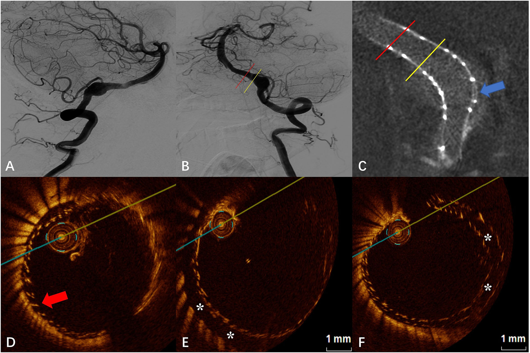 (A) Digital subtraction angiography (DSA) before the flow-diverter placement. (B) Digital subtraction angiography (DSA) just after the flow-diverter placement. (C) Vaso CT images. Localized malapposition in distal parent artery (blue arrow) and proximal parent artery with good apposition of the FD to the wall. Artifacts near the aneurysm neck that disturb the evaluation of apposition by Vaso CT (red arrows). (D) OCT image. Corresponding to localized malapposition [blue arrow in (C)] confirmed by Vaso CT (*). (E) OCT image. The corresponding yellow line in (B,C). Eccentric communication malapposition near the aneurysm neck (*). (F) OCT image. The corresponding red line in (B,C). Circumferential communication malapposition at the aneurysm (*).