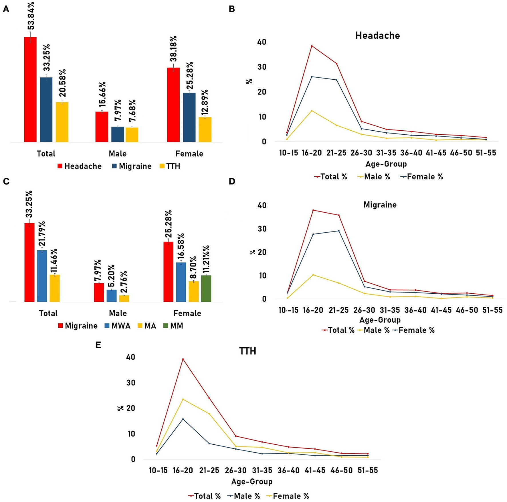 Prevalence of headache and its types. (A) Prevalence of headache with migraine and tension-type headaches (TTH) adjusted for gender. (B) Age and gender-adjusted prevalence of headache. (C) Prevalence of migraine and its type [Migraine Without Aura (MWA) and Migraine with Aura (MA)] adjusted for gender. (D) Age and gender-adjusted prevalence of migraine. (E) Age and gender-adjusted prevalence of TTH.