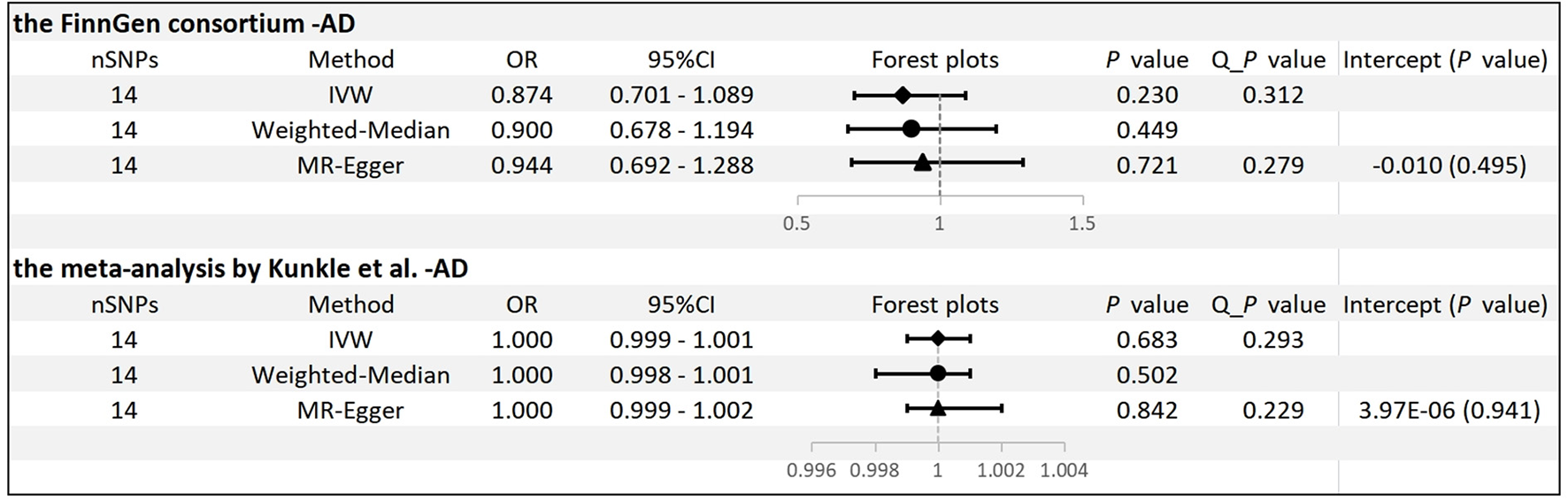 In summary, this is the first MR study to explore the genetic association between ADPN and the risk of AD. The results of our MR study do not support the hypothesis that circulating ADPN may reduce the risk of AD, and further studies are needed to verify our results in the real world.