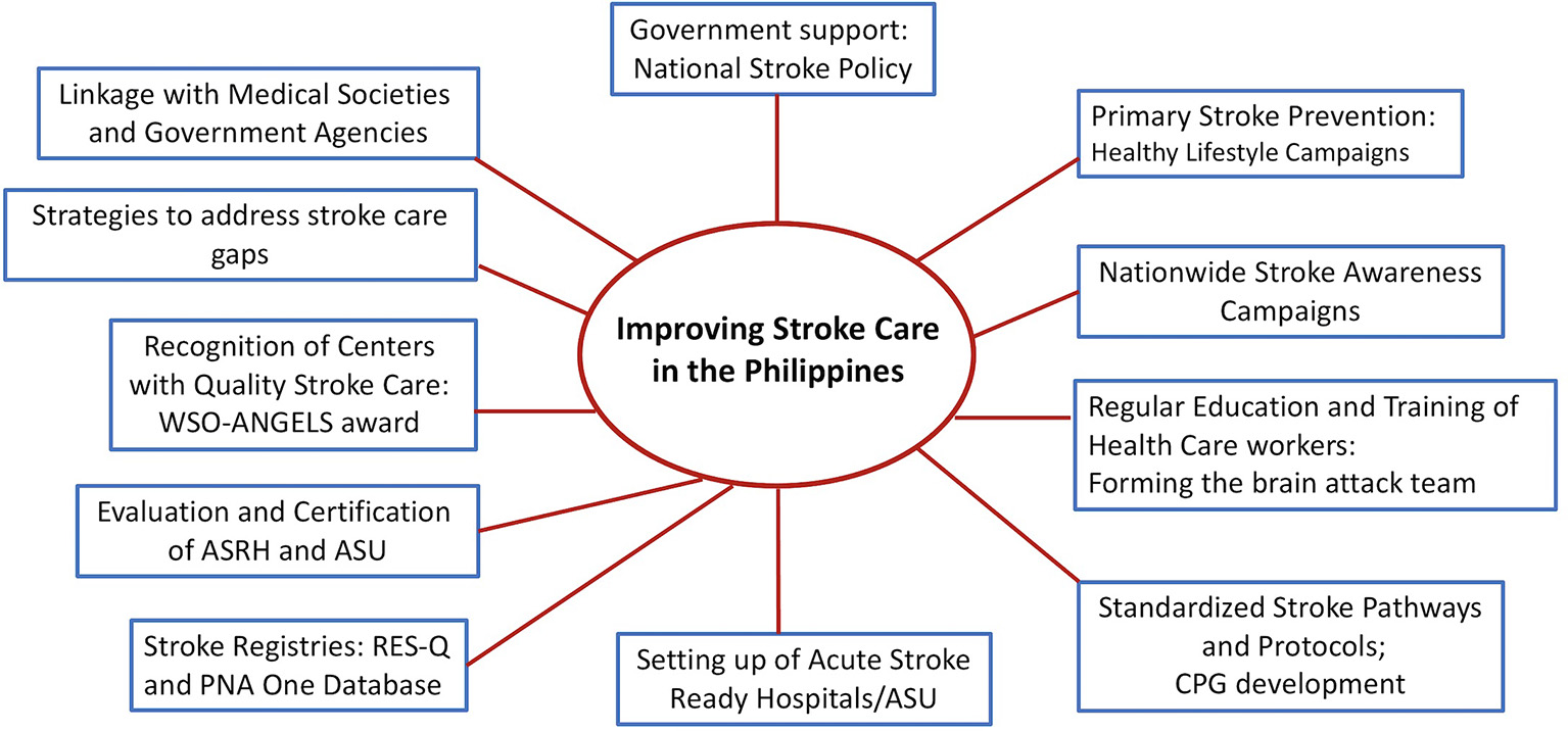 Strategies to address stroke care gaps included community awareness, training of neurologists and nurses on acute stroke care, standardization of stroke protocols, setting up of ASRH and ASU and stroke registries. However, there is still a need to increase community stroke awareness, upgrading in Philippine health insurance, development of adequate stroke infrastructures and network which will greatly improve stroke outcomes.