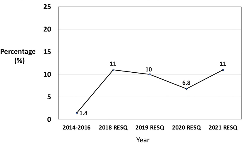 In 2014–2016, the thrombolysis rate (Figure 3) was low at 1.4% of all acute ischemic strokes. Through various stroke training and education in the different areas of the country by the stroke society, the thrombolysis rate increased to 11% in 2021 based on RES-Q database (45). The Res-Q database is participated by 27 ASRH hospitals but not all stroke cases are encoded as only a minimum of 30 representative cases per quarter are encoded. There was a slight decrease in the thrombolysis rate during the COVID pandemic in 2020. The PNA Stroke Database (45) is participated by 11 Neurology training institutions and encodes all stroke cases seen at the training hospitals. There is a higher thrombolysis rate in the public hospitals (Table 1) since the medicine rTPA is subsidized by the government. The initial cost of one vial of rTPA was 1,200 USD but in 2020, the cost was reduced to 600 USD through a government executive order regulating prices of drugs and medicines to improve access to health care (4).