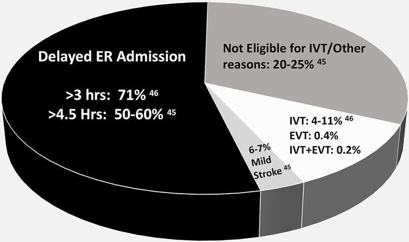Of all the acute ischemic strokes patients, 50%−60% in the RES-Q database and 71% in the PNA Database arrive at the ER beyond 3 h from the time of stroke (Figure 4) (44, 45).