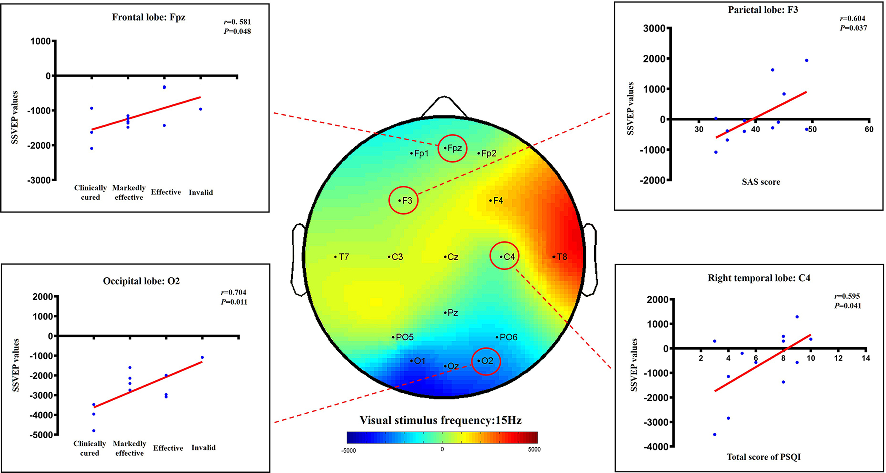 In addition, our results also demonstrated a certain positive correlation between the total PSQI score, SAS score, efficacy level, and SSVEP value in the AA group. This positive correlation is reflected in the following results: C4 and the total score of PSQI (r = 0.595, P = 0.041), F3 and SAS score (r = 0.604, P = 0.037), FPz and the efficiency level of the frontal lobe (r = 0.581, P = 0.048), and O2 and efficiency level of the occipital lobe (r = 0.704, P = 0.011) (Figure 10).